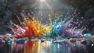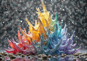 AI-generated dynamic liquid fluid art — explosive rainbow-colored liquid splash in UHD photorealistic 3D renders.
