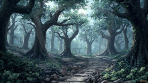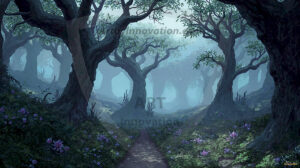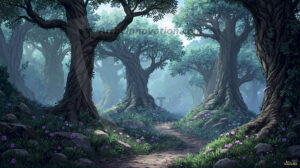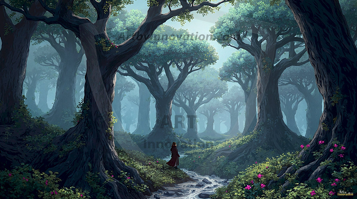 AI-generated mystical woodland art — enchanted forests with glowing mushrooms, ancient trees, and magical folklore atmosphere.