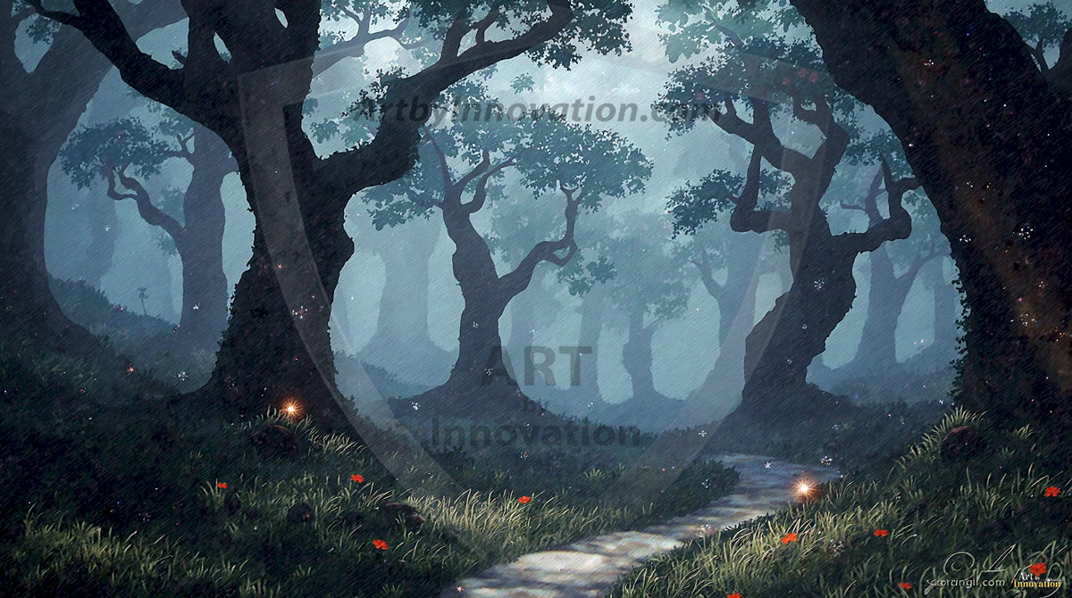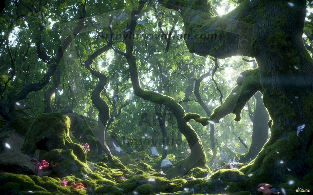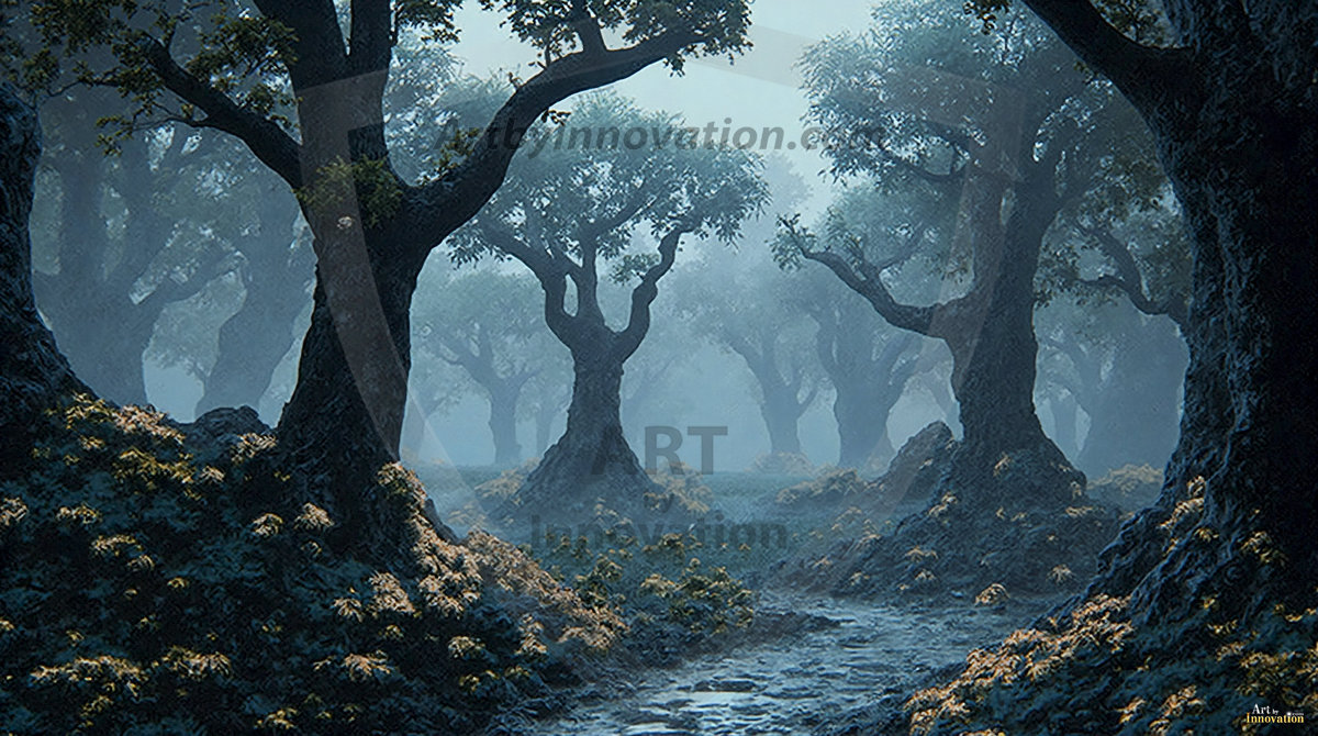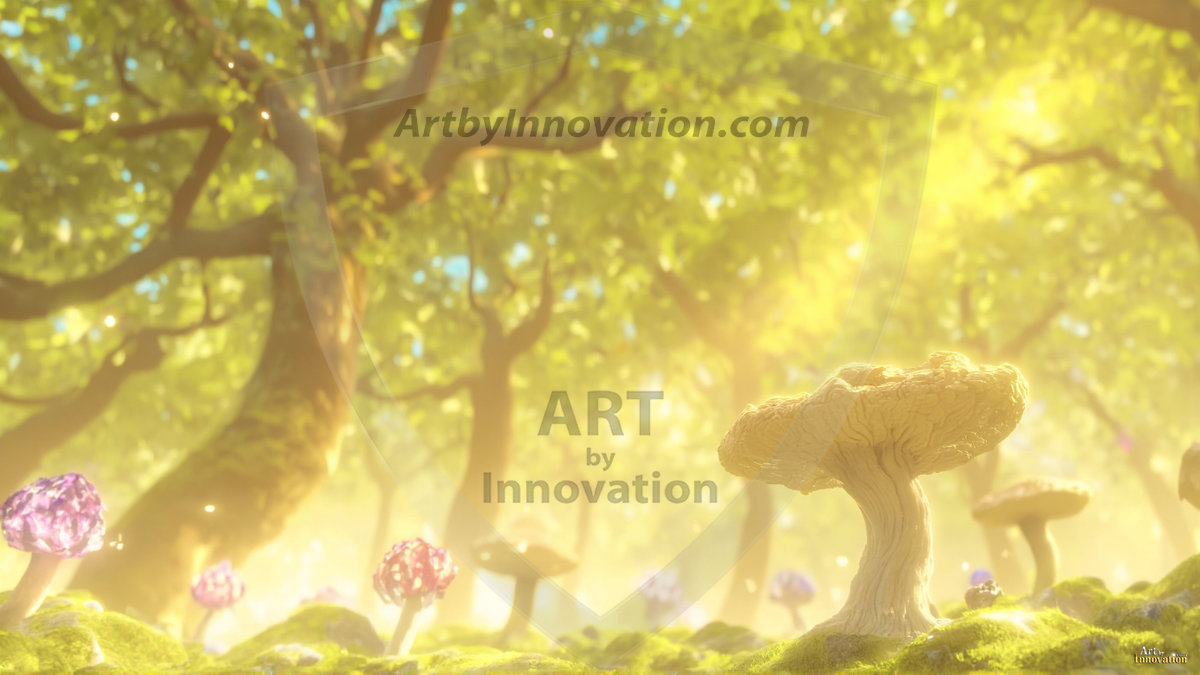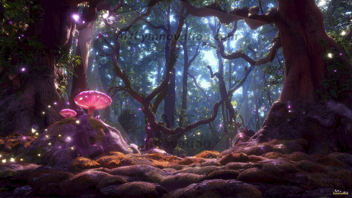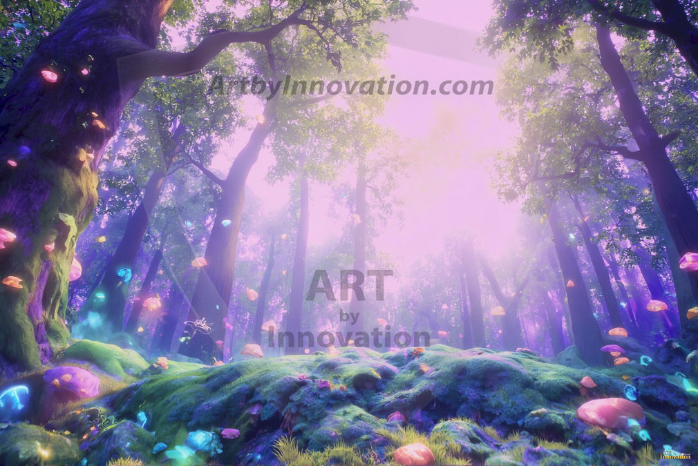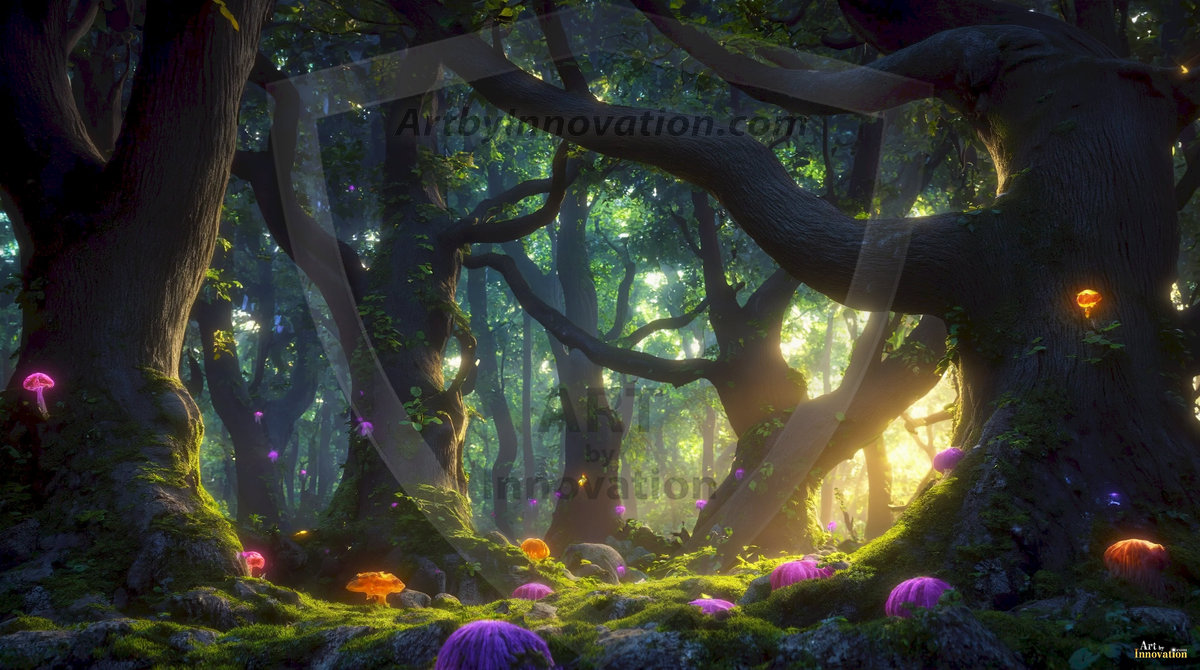 AI-generated mystical woodland art — enchanted forests with glowing mushrooms, ancient trees, and magical folklore atmosphere.