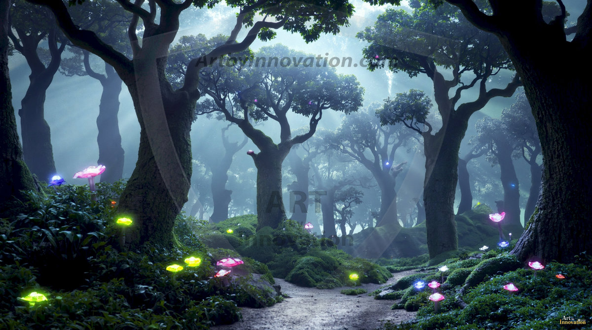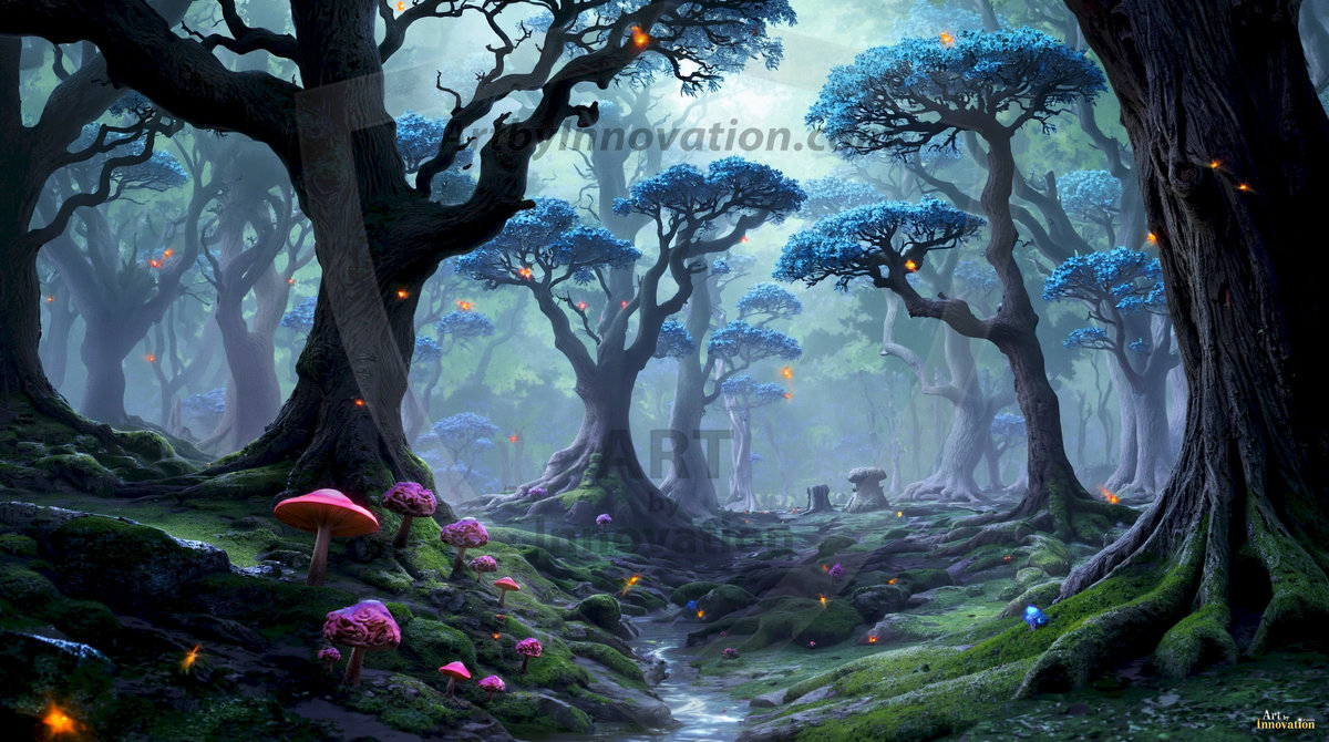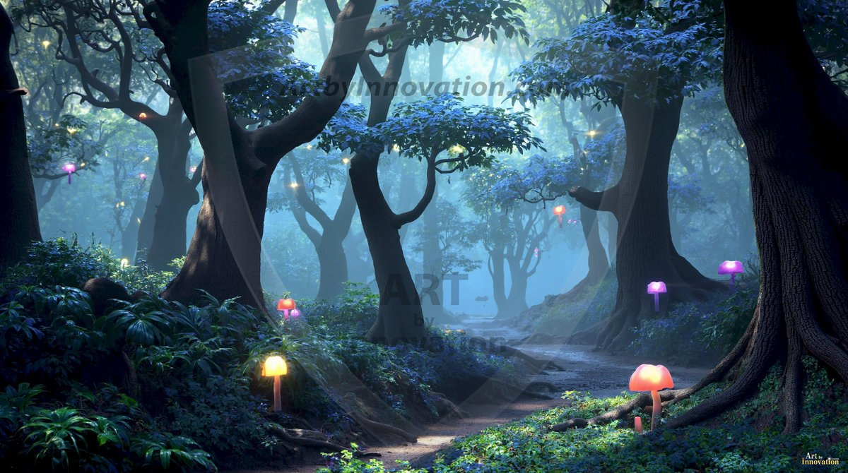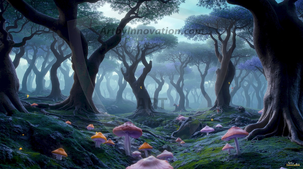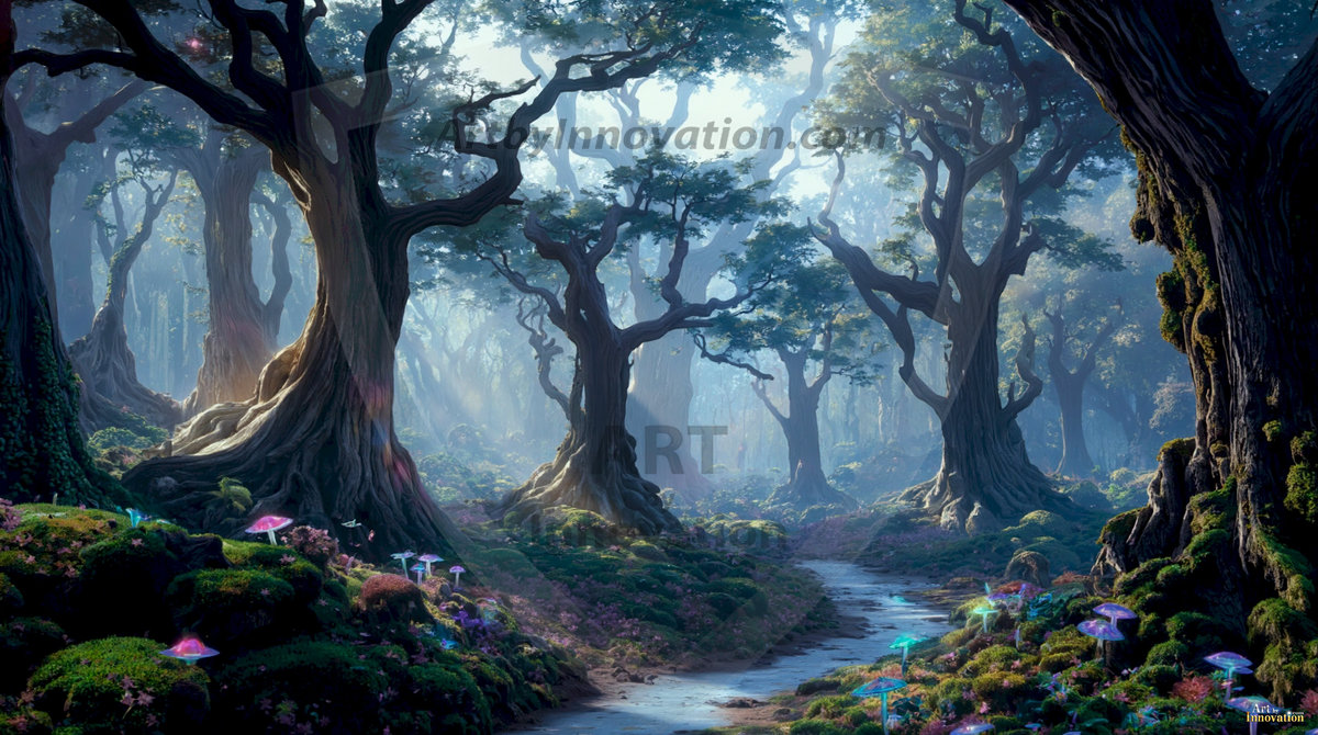 AI-generated mystical woodland art — enchanted forests with glowing mushrooms, ancient trees, and magical folklore atmosphere.