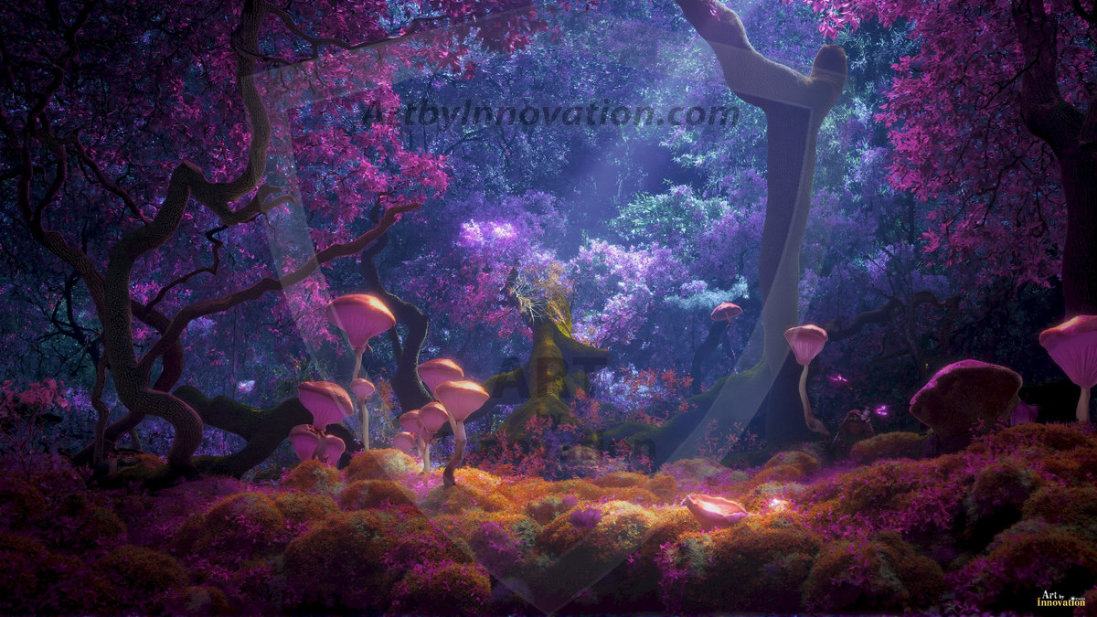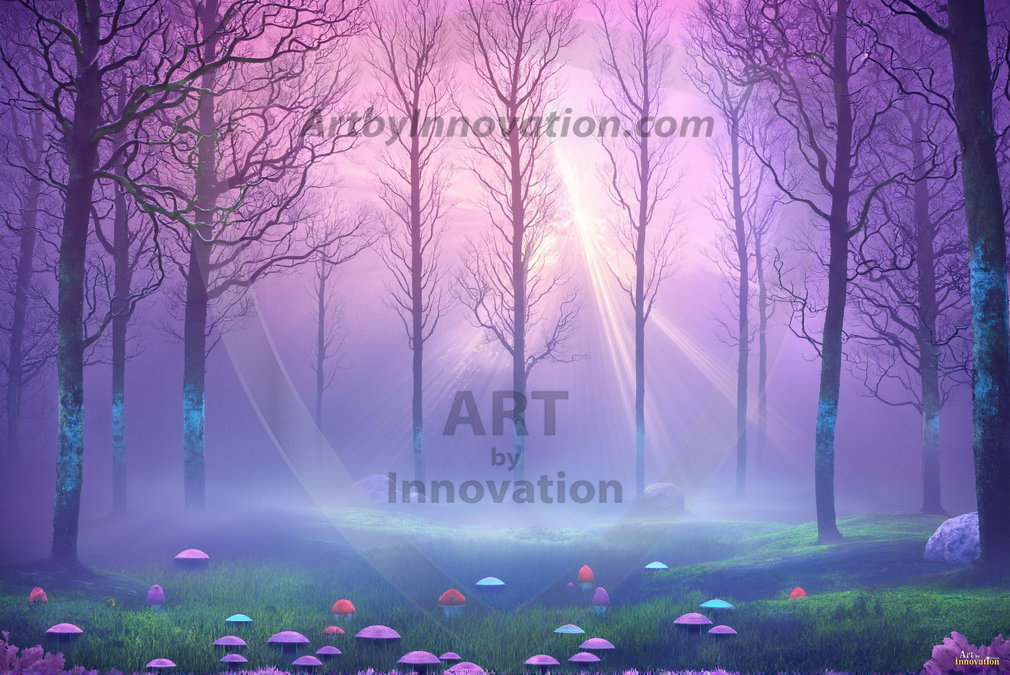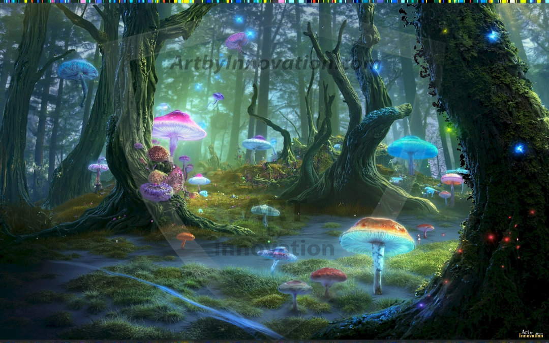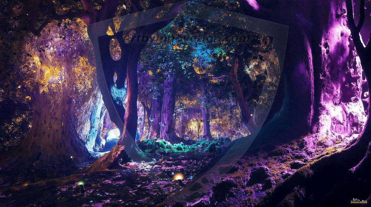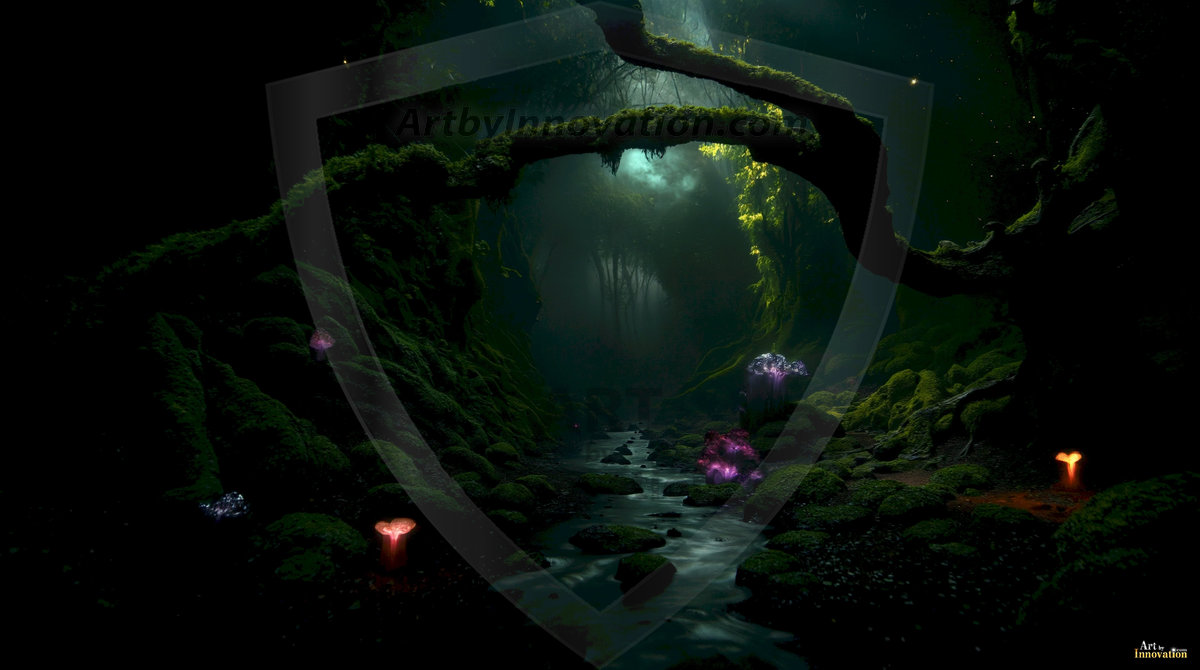 AI-generated mystical woodland art — enchanted forests with glowing mushrooms, ancient trees, and magical folklore atmosphere.