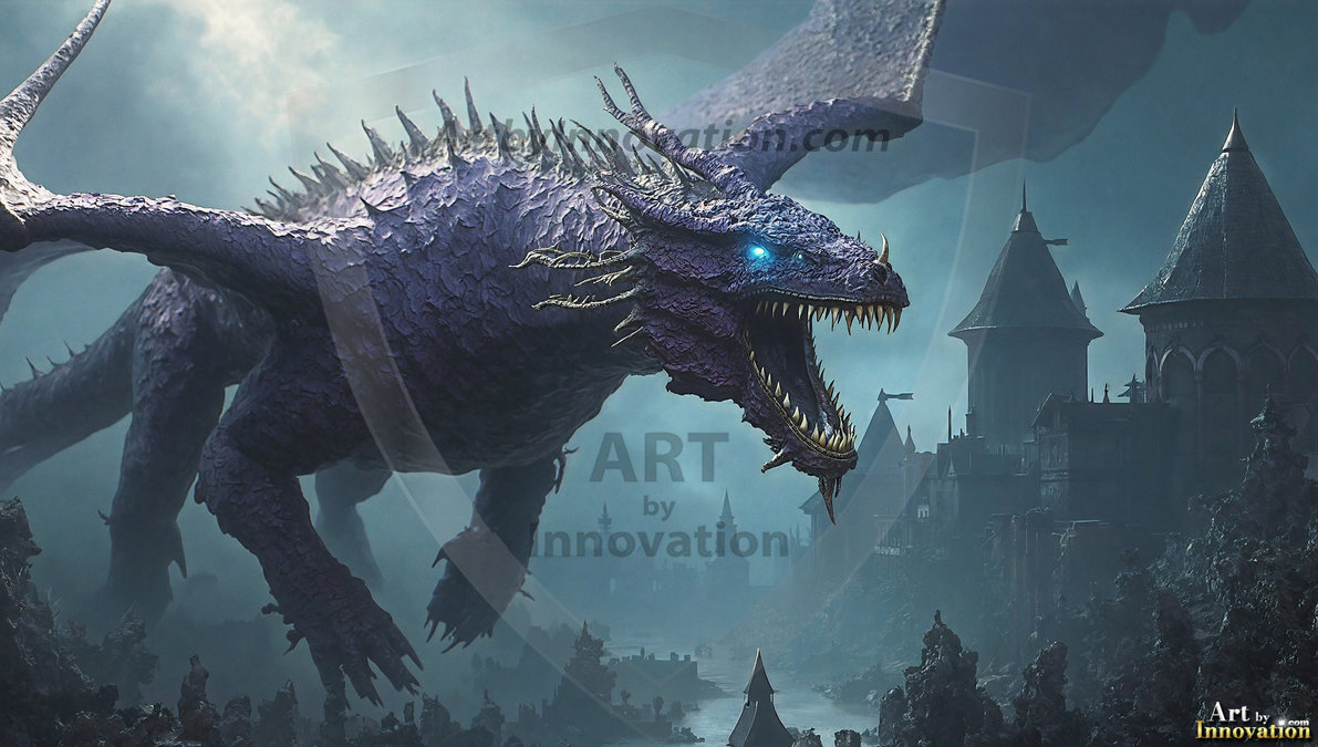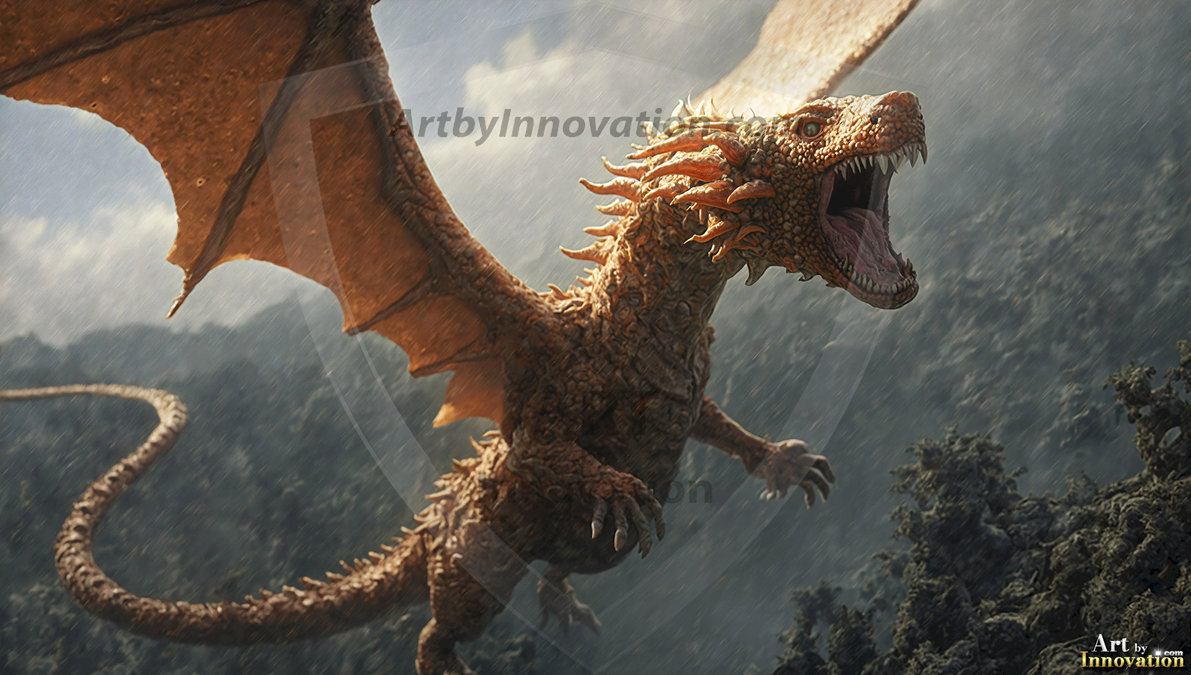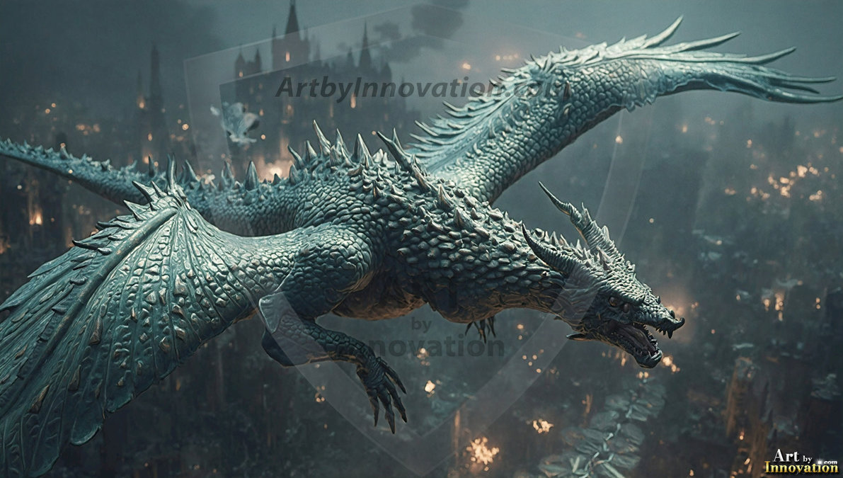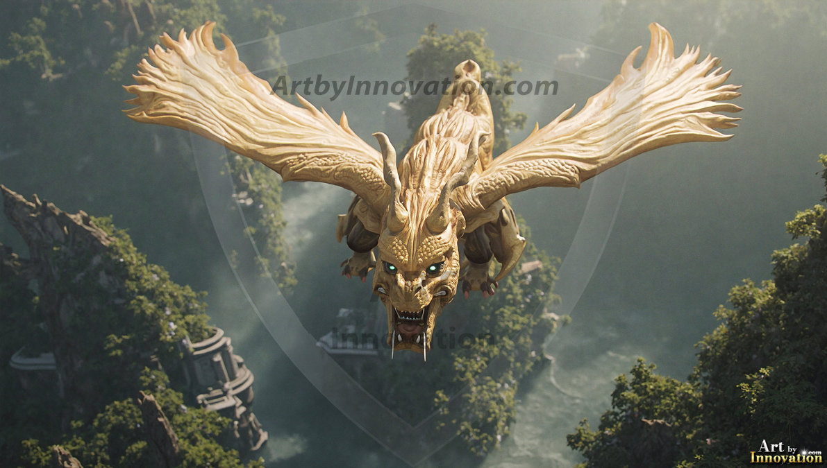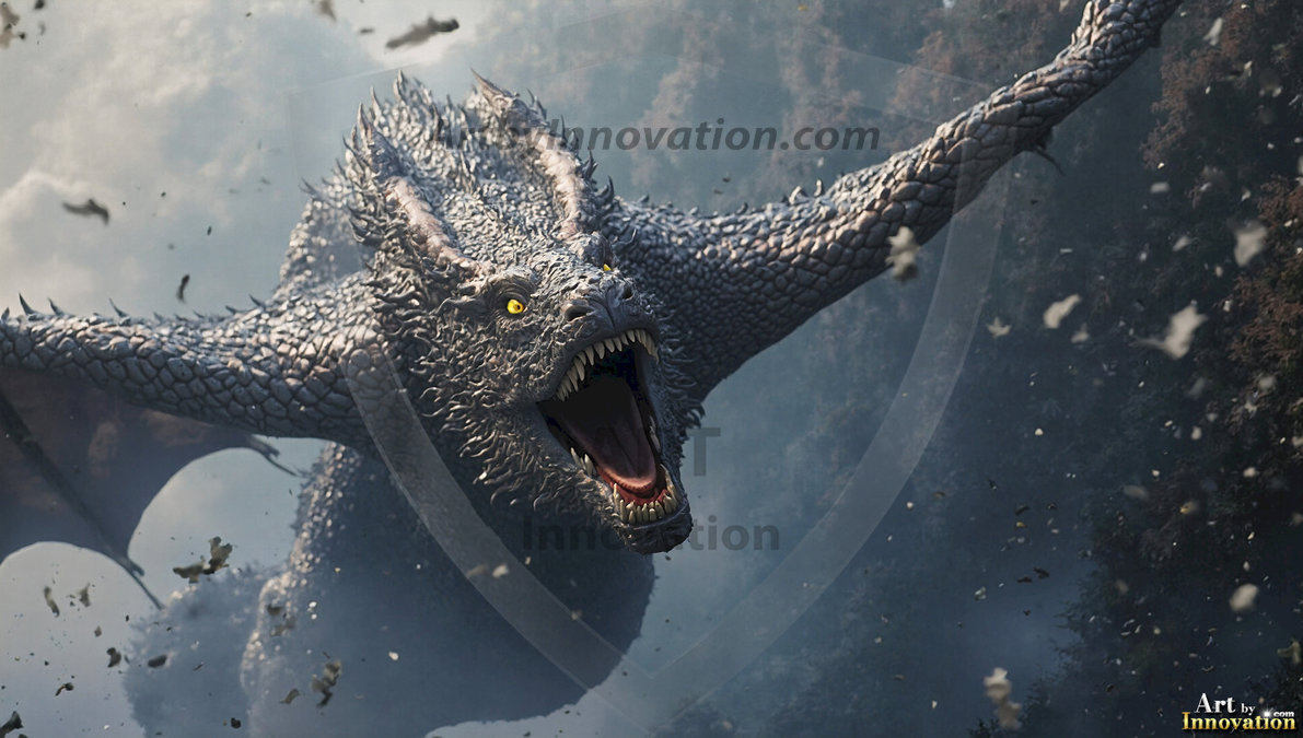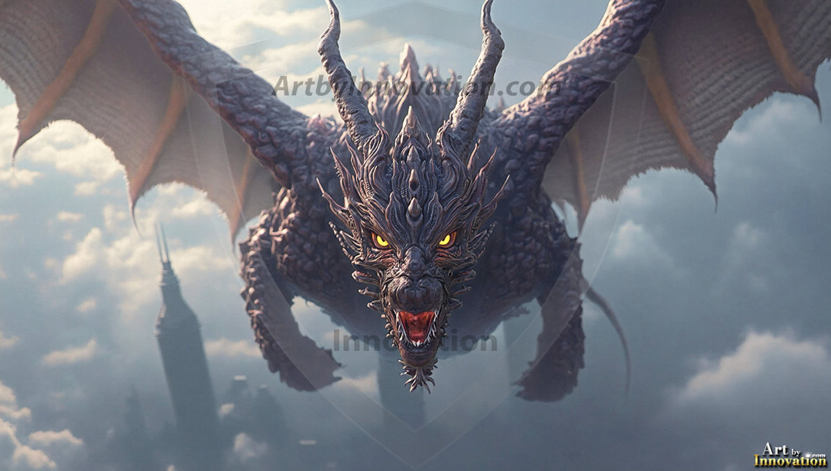 AI-generated powerful majestic dragon art — fire-breathing giants, Bahamut the Dragon God, and epic fantasy dragon scenes.