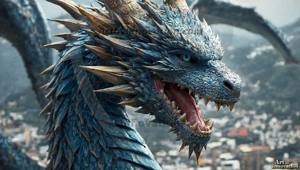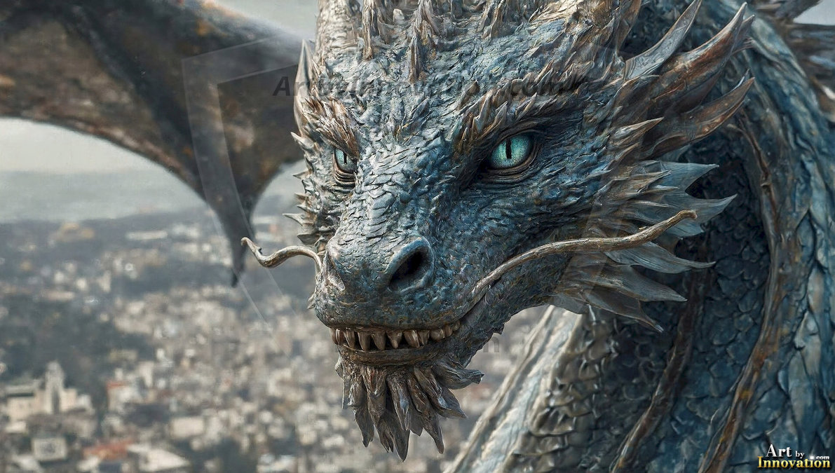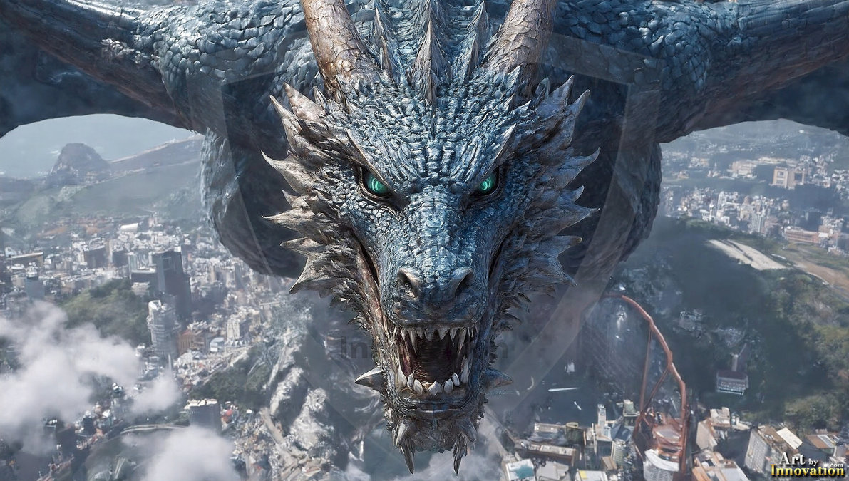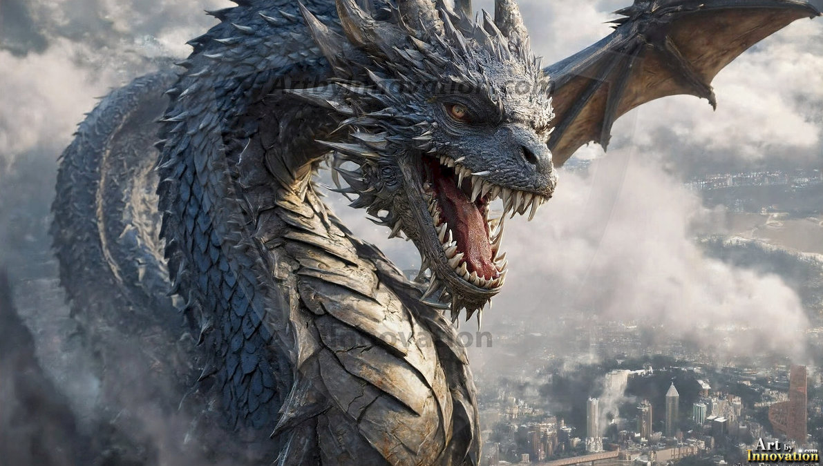 AI-generated powerful majestic dragon art — fire-breathing giants, Bahamut the Dragon God, and epic fantasy dragon scenes.