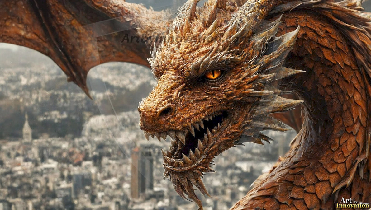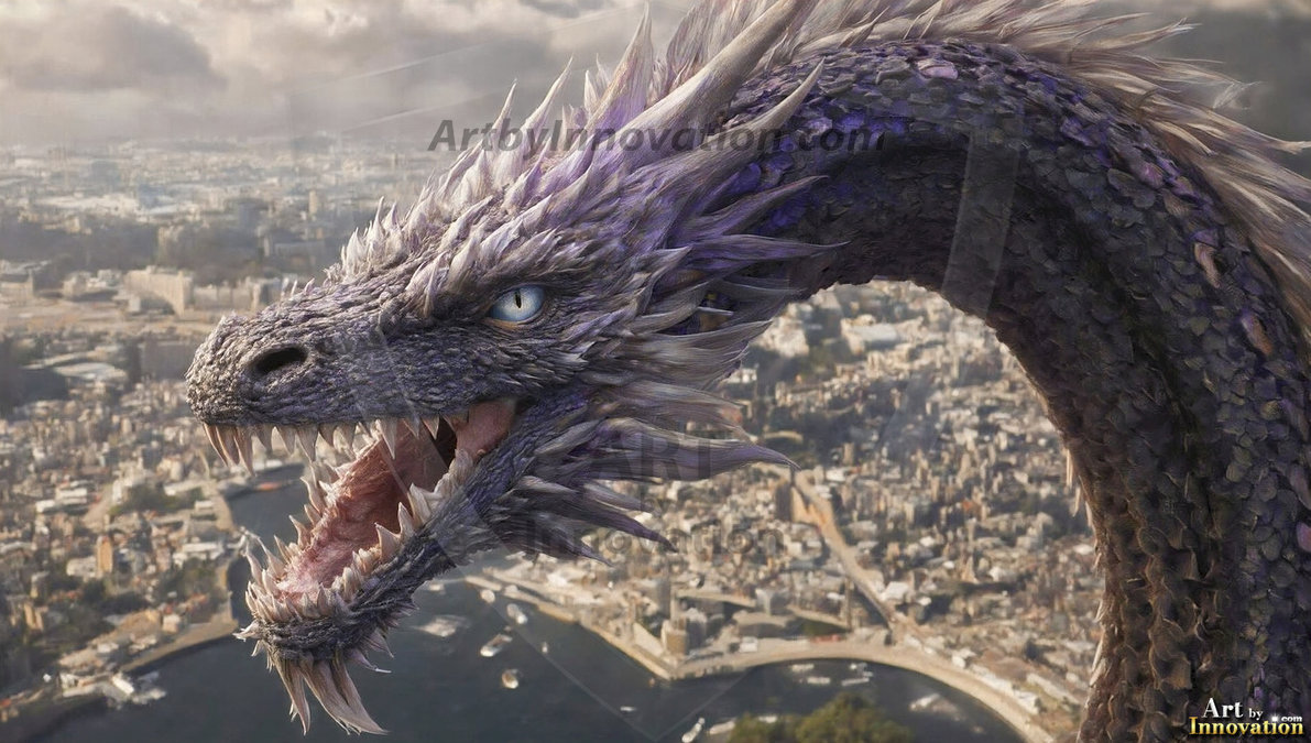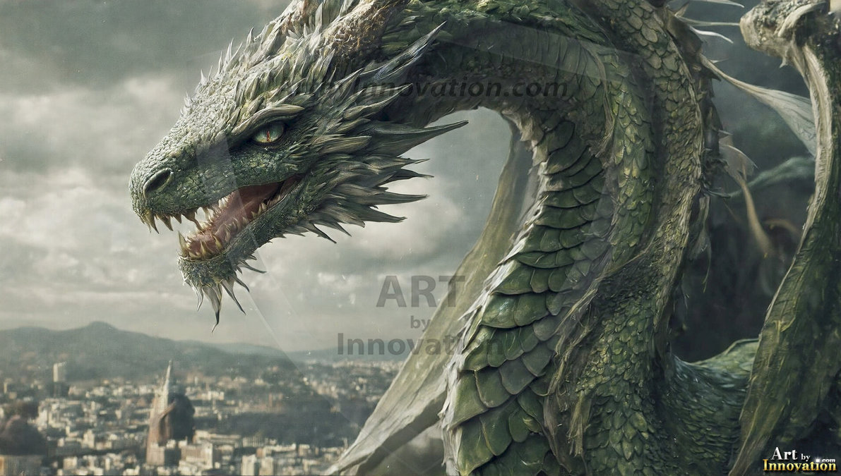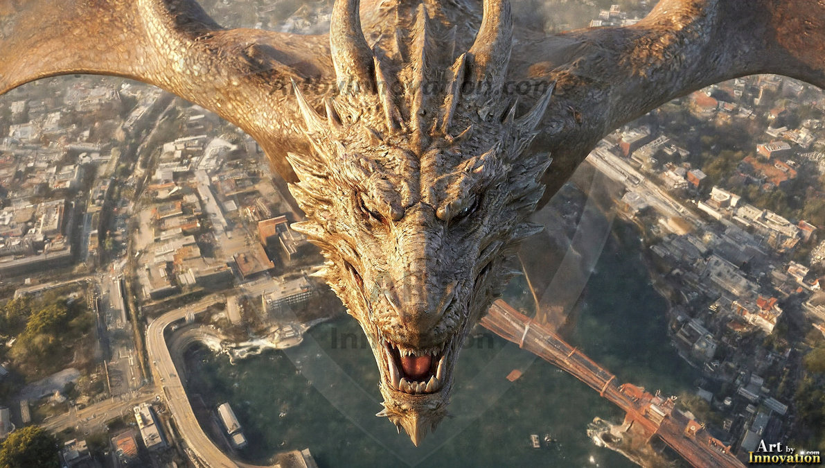 AI-generated powerful majestic dragon art — fire-breathing giants, Bahamut the Dragon God, and epic fantasy dragon scenes.