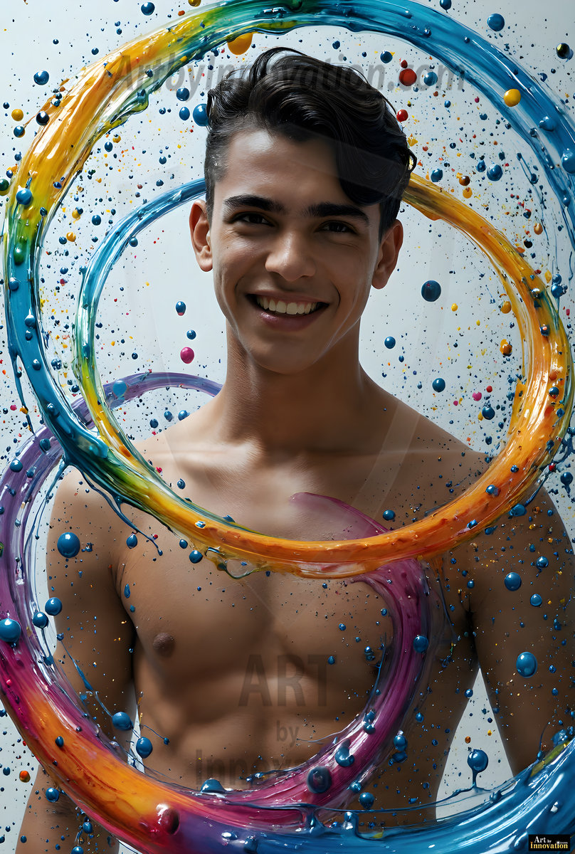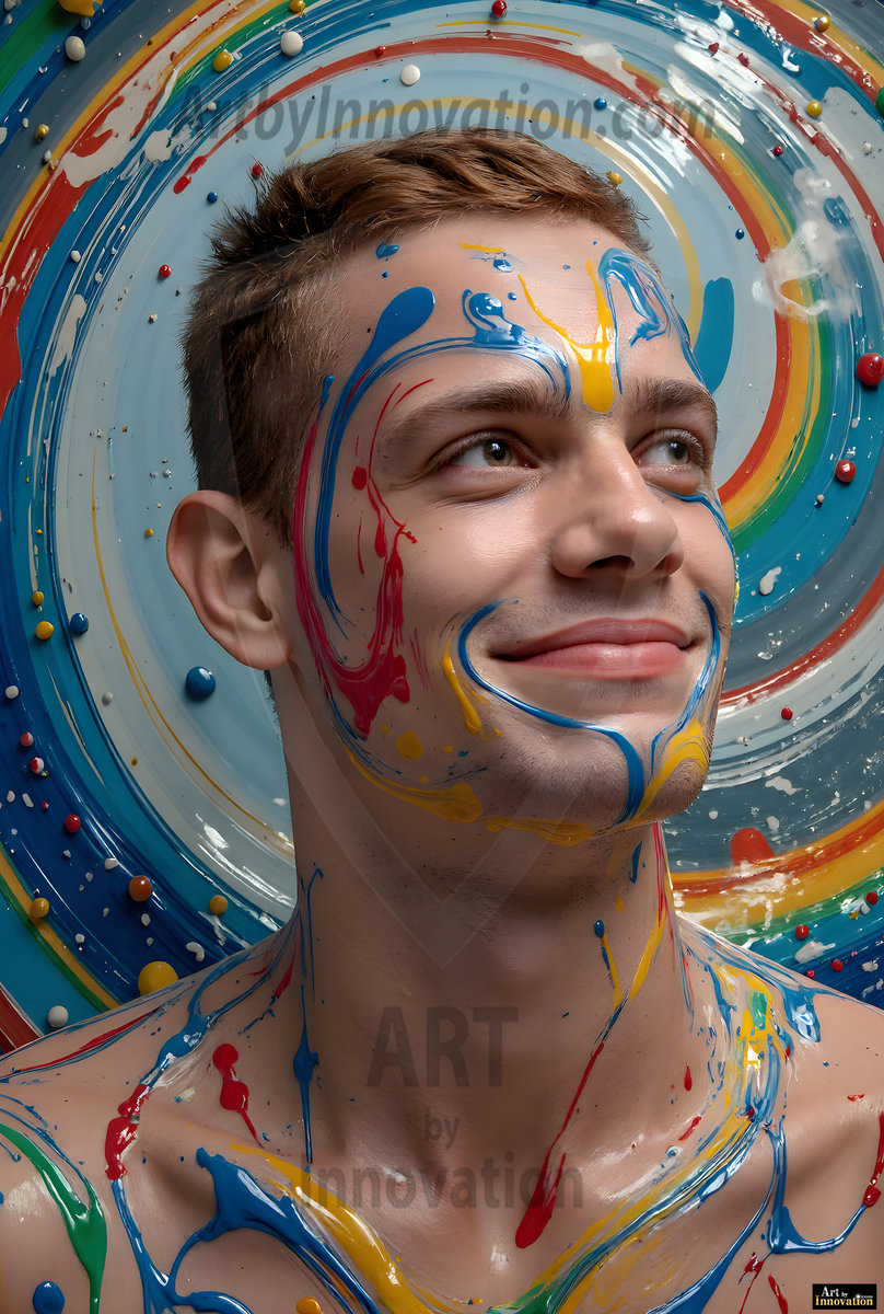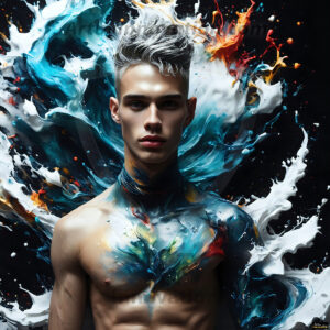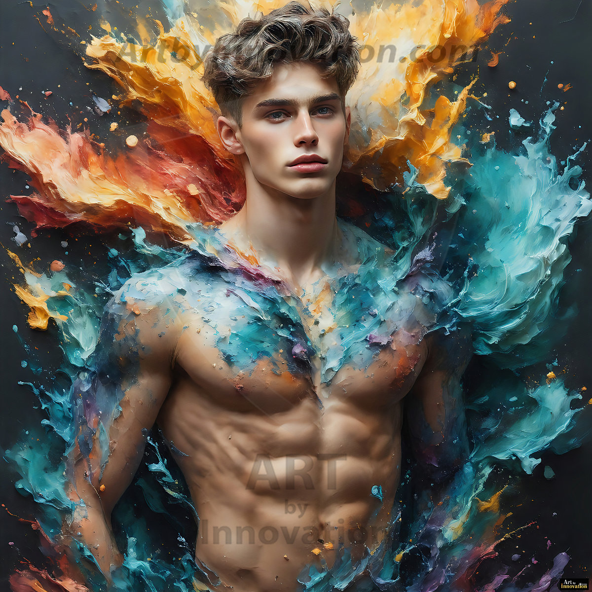 Fluid, dynamic, and breathtaking — this AI-generated abstract art collection captures handsome men in a cosmic dance with colorful liquid and light. Powerful swirls of vibrant, iridescent fluid erupt and cascade around them, forming swirling vortexes of rainbow color that respond to their every movement. Part fantasy, part surrealism, and entirely extraordinary. Created using Flux.1, ComfyUI, and Stable Diffusion by © Jeff Dupler | Art by Innovation | https://www.artbyinnovation.com