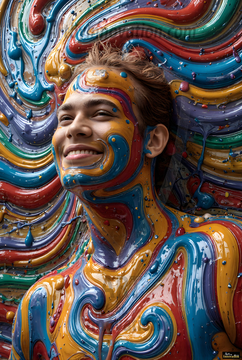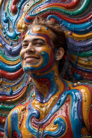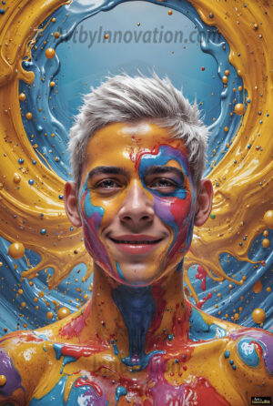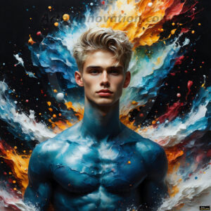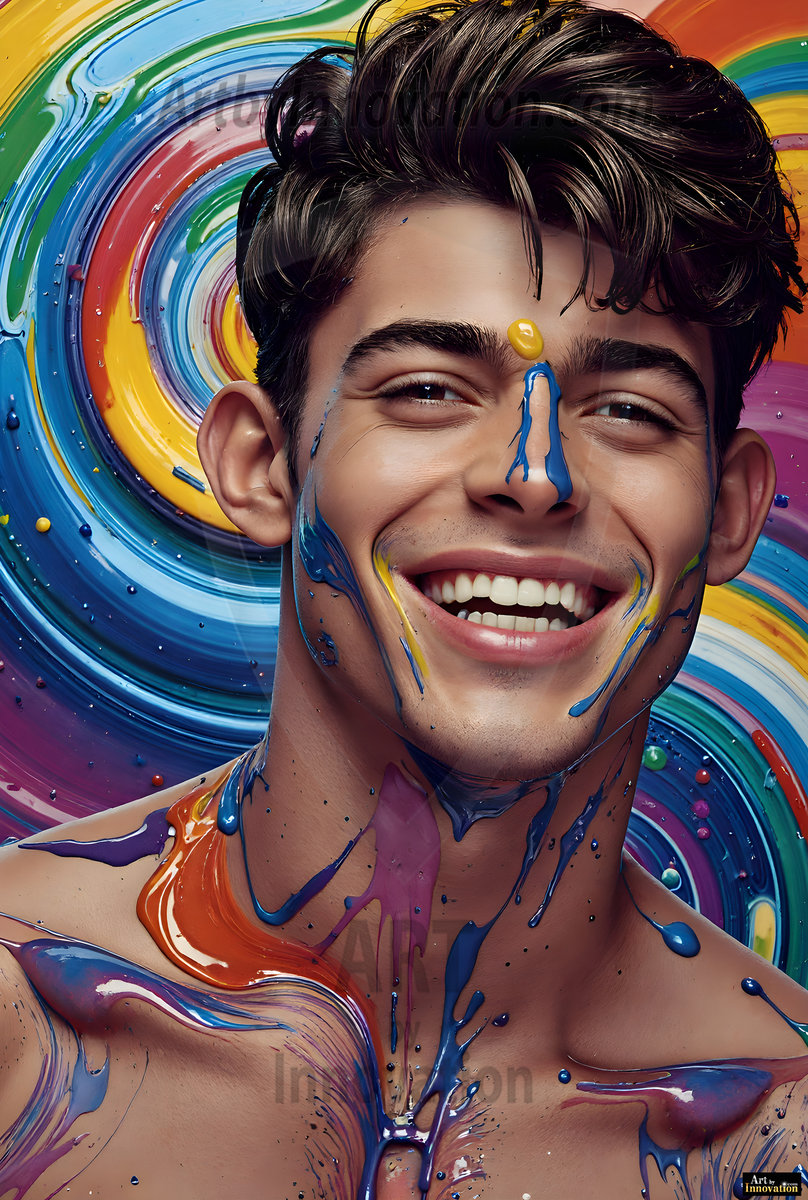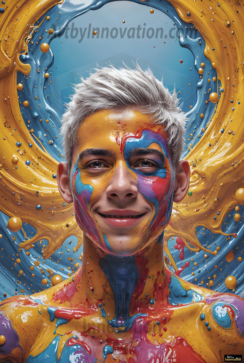 Fluid, dynamic, and breathtaking — this AI-generated abstract art collection captures handsome men in a cosmic dance with colorful liquid and light. Powerful swirls of vibrant, iridescent fluid erupt and cascade around them, forming swirling vortexes of rainbow color that respond to their every movement. Part fantasy, part surrealism, and entirely extraordinary. Created using Flux.1, ComfyUI, and Stable Diffusion by © Jeff Dupler | Art by Innovation | https://www.artbyinnovation.com