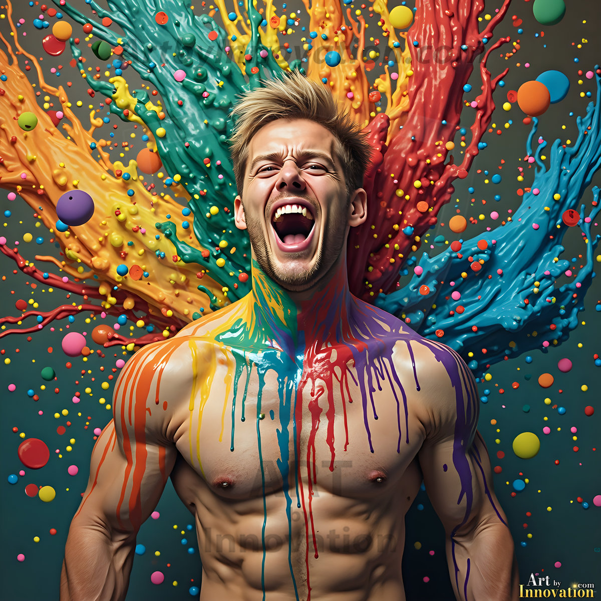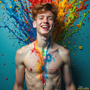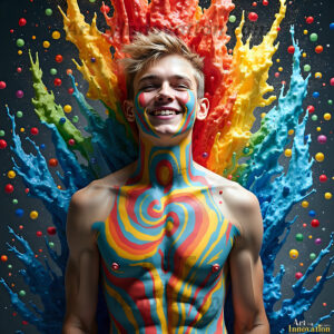 When paint attacks and makes people happy — it's Art! This AI-generated abstract art collection features beautiful, handsome, shirtless men full of excitement and joy, covered in vibrant body paint as colorful explosions erupt around them. Each image captures a moment of pure happiness — huge smiles, paint bombs going off, rainbow colors flying. Combining photorealistic skin texture with surreal abstract paint dynamics, these images are as joyful as they are stunning. Created using Flux.1, ComfyUI, and Stable Diffusion by © Jeff Dupler | Art by Innovation | https://www.artbyinnovation.com