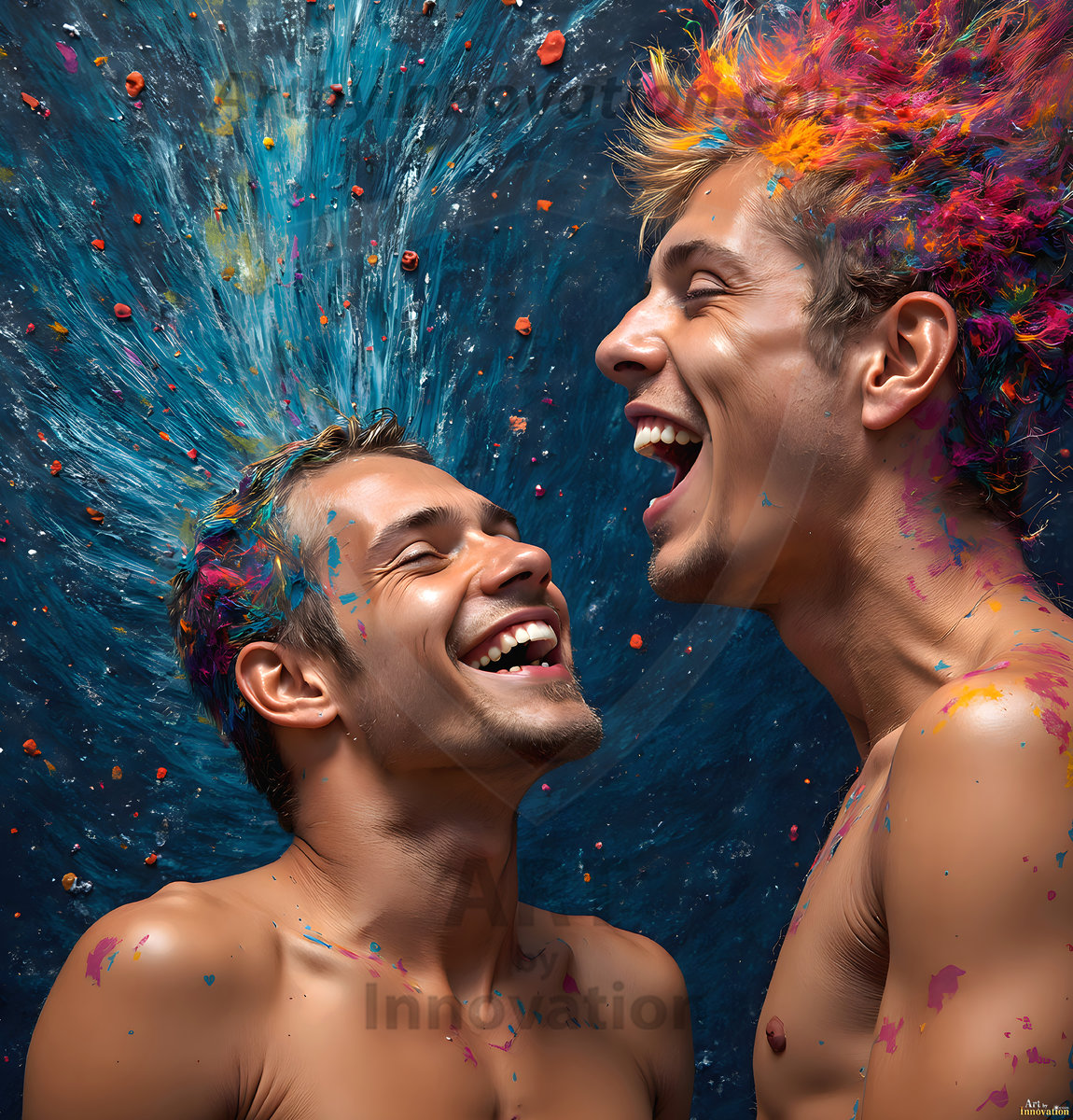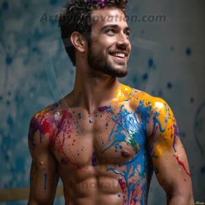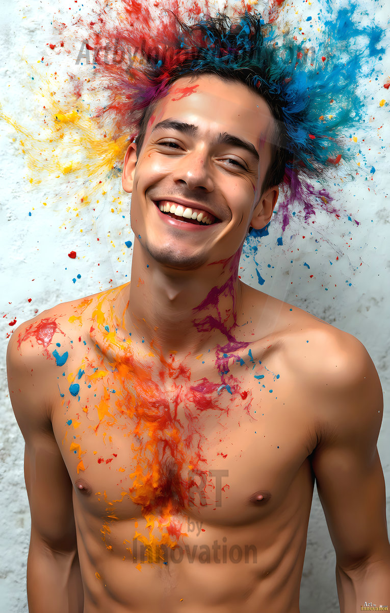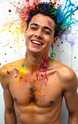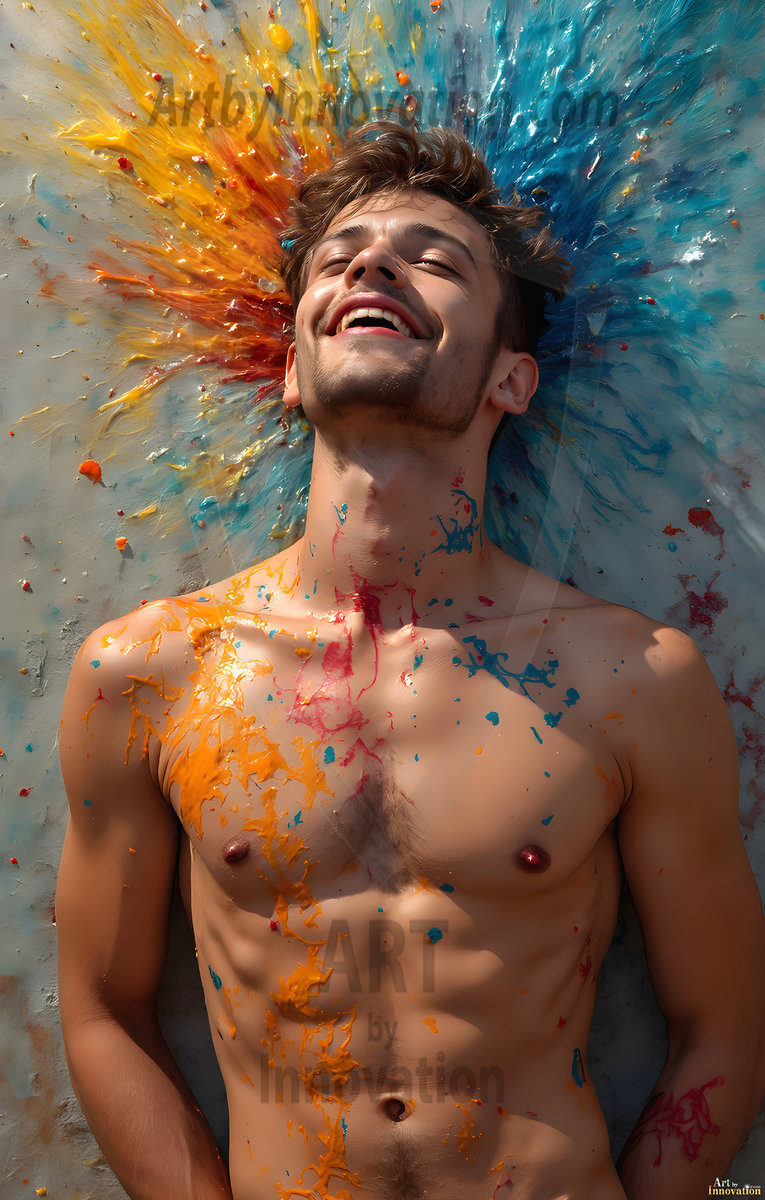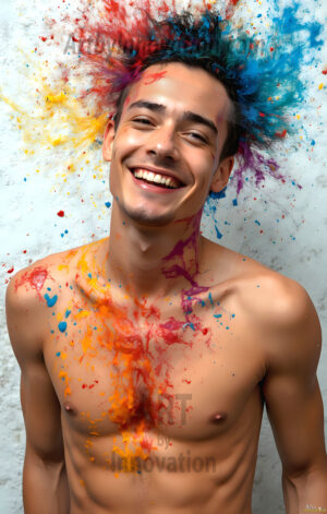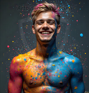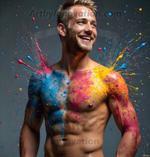 ByjeffAI-generated abstract art — hot handsome men covered in colorful body paint explosions, full of joy and rainbow color.