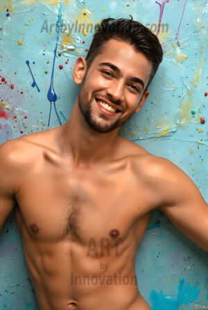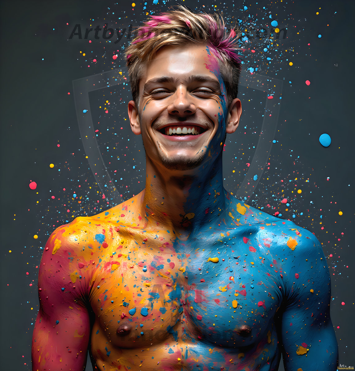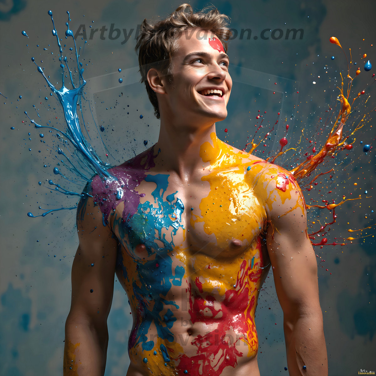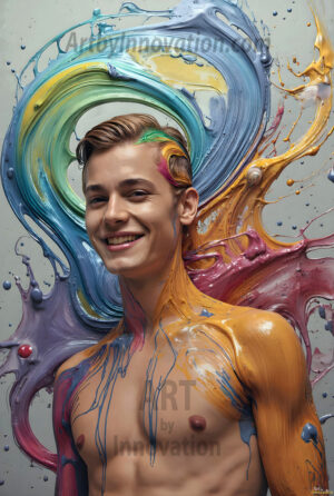 ByjeffAI-generated abstract art — hot handsome men covered in colorful body paint explosions, full of joy and rainbow color.