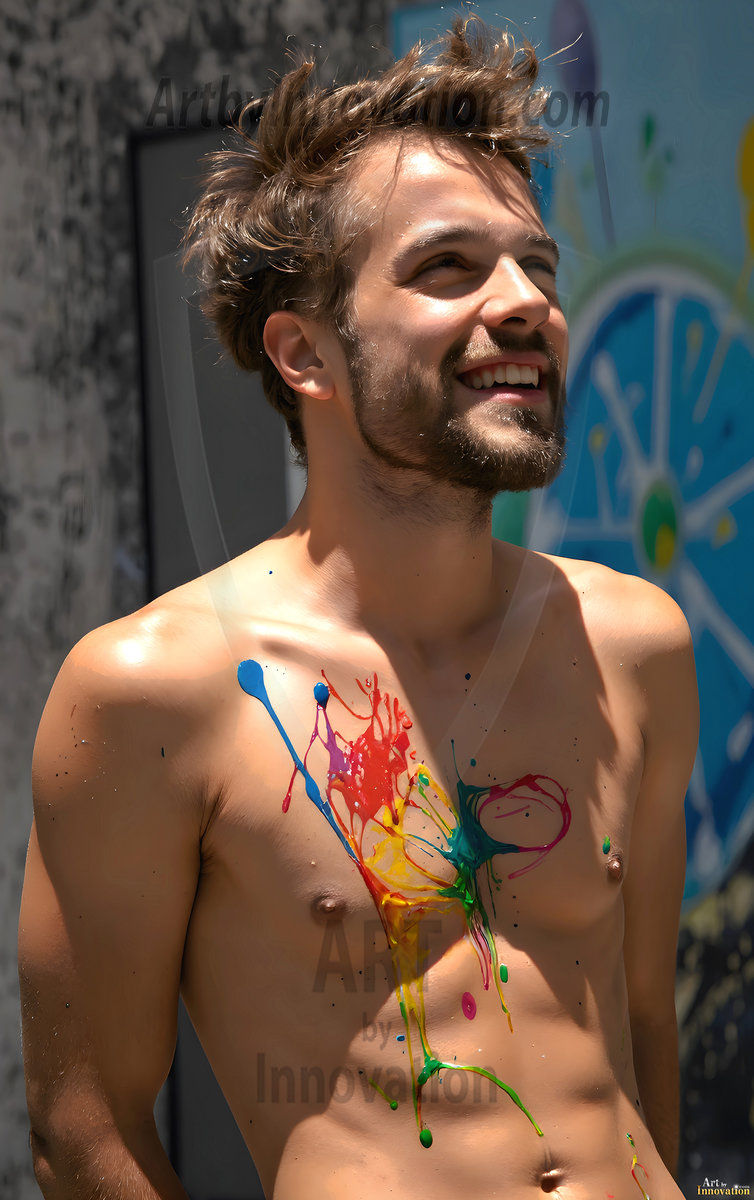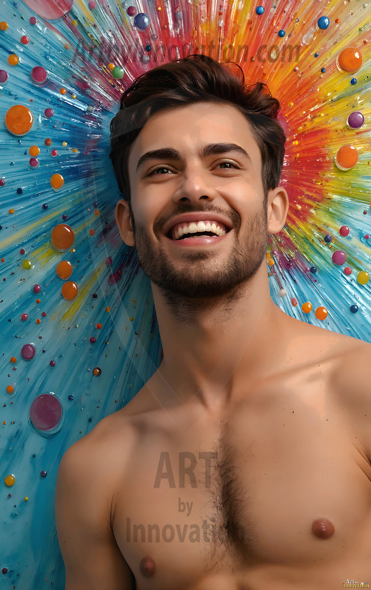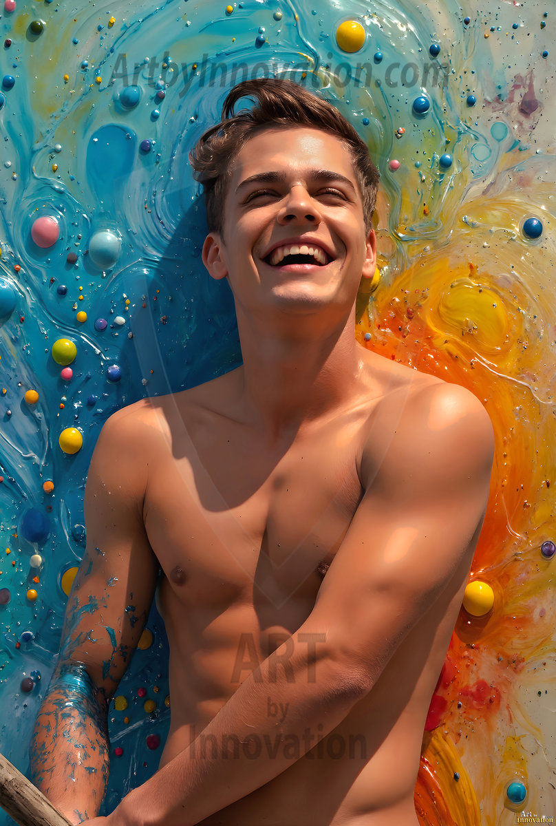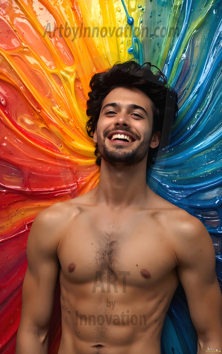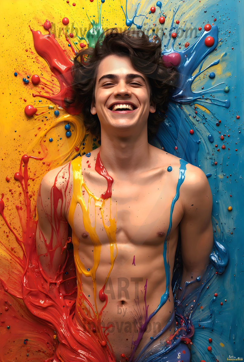 AI-generated abstract art — hot handsome men covered in colorful body paint explosions, full of joy and rainbow color.