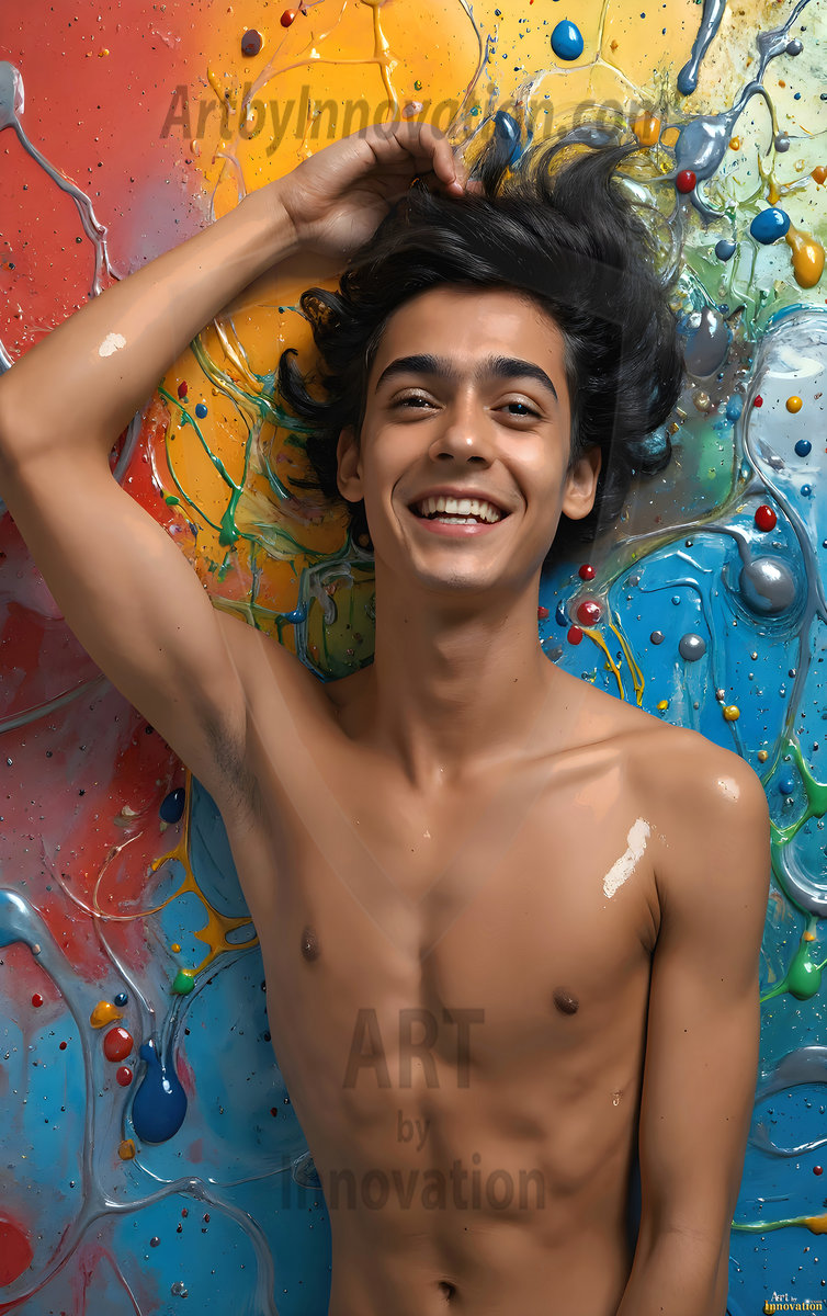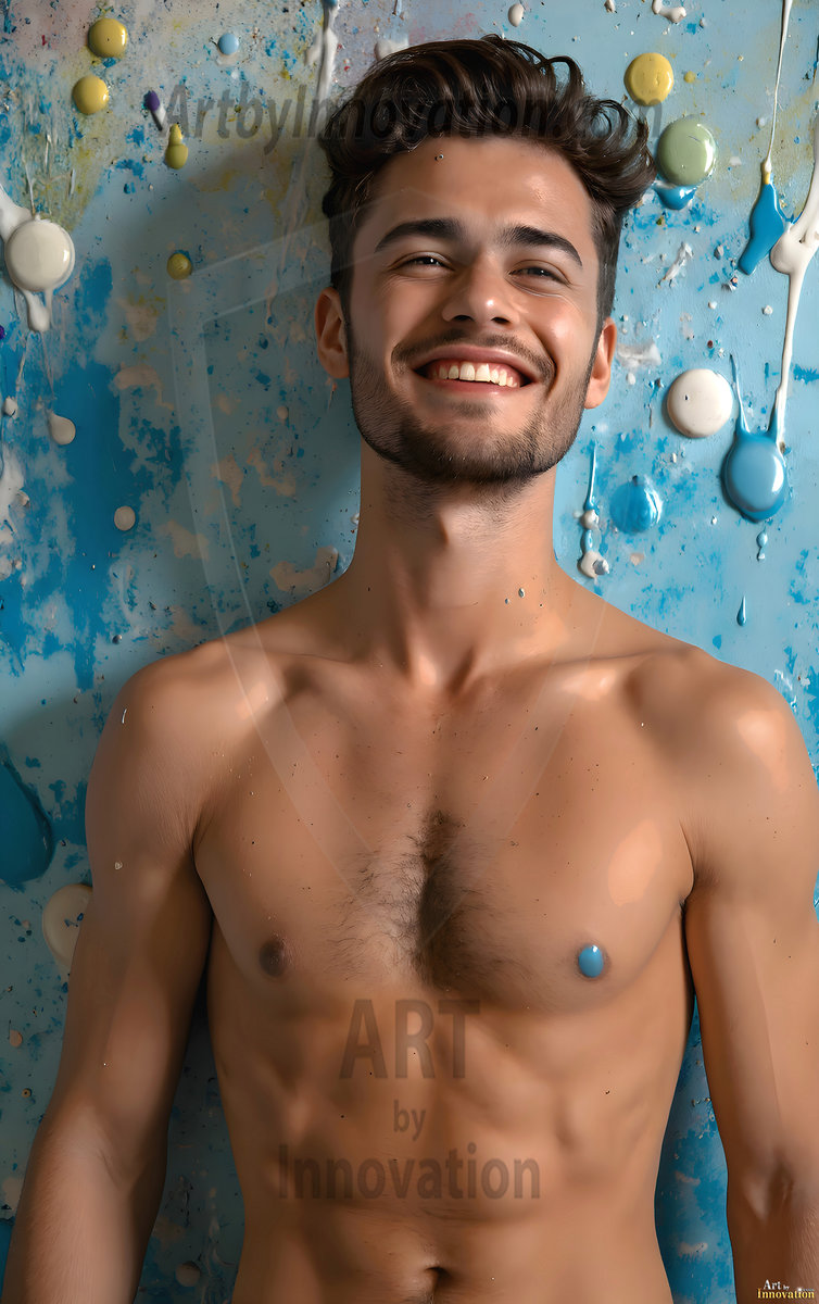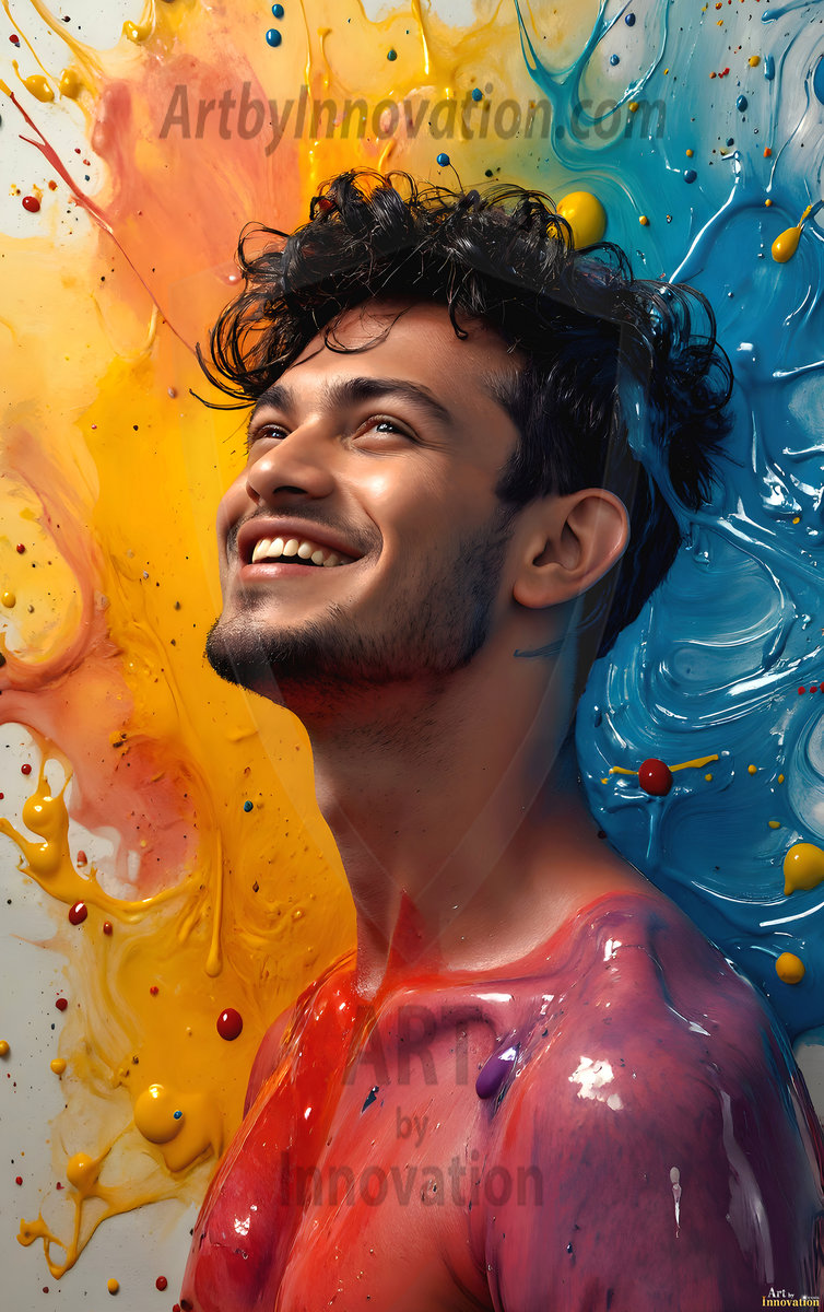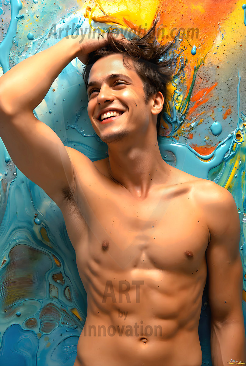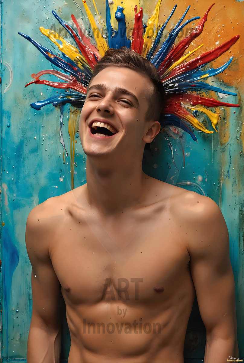 AI-generated abstract art — hot handsome men covered in colorful body paint explosions, full of joy and rainbow color.