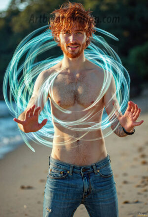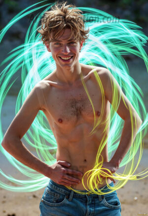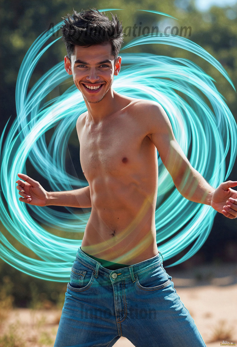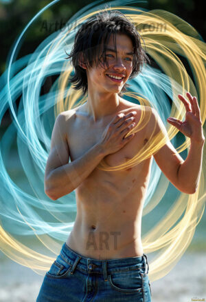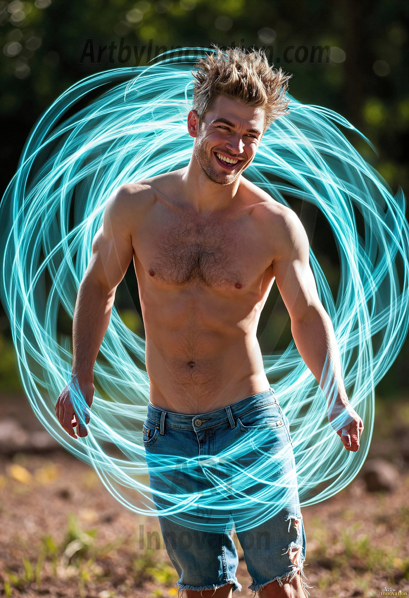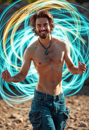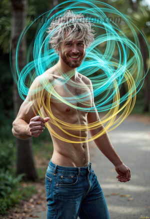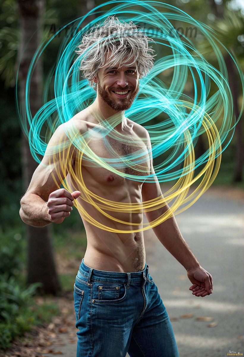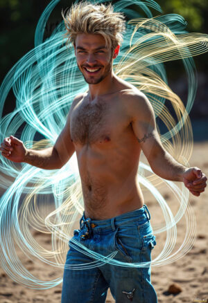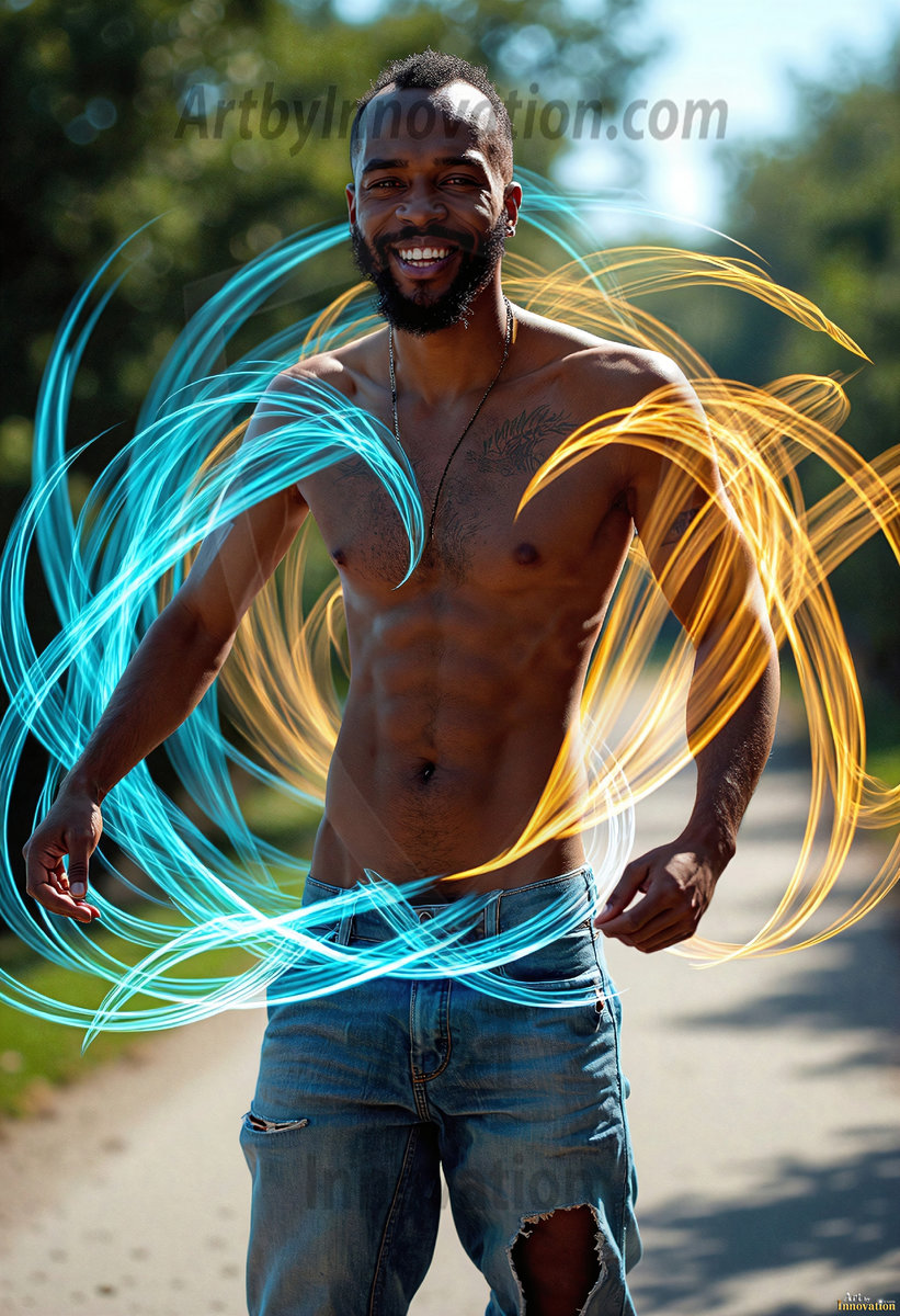 Where elegance and raw energy collide. This AI-generated abstract art collection features handsome, shirtless men dancing with radiant colorful light rays that wrap around their bodies in flowing, otherworldly patterns. The dynamic light trails — yellow, blue, purple, gold — emphasize their movements and add an ethereal fluidity, making each image feel like a moment suspended in time. Part dance, part cosmic phenomenon, entirely mesmerizing. Created using Flux.1, ComfyUI, and Stable Diffusion by © Jeff Dupler | Art by Innovation | https://www.artbyinnovation.com
