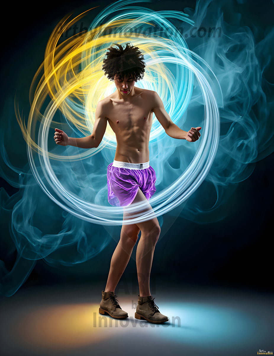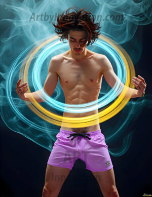 Where elegance and raw energy collide. This AI-generated abstract art collection features handsome, shirtless men dancing with radiant colorful light rays that wrap around their bodies in flowing, otherworldly patterns. The dynamic light trails — yellow, blue, purple, gold — emphasize their movements and add an ethereal fluidity, making each image feel like a moment suspended in time. Part dance, part cosmic phenomenon, entirely mesmerizing. Created using Flux.1, ComfyUI, and Stable Diffusion by © Jeff Dupler | Art by Innovation | https://www.artbyinnovation.com