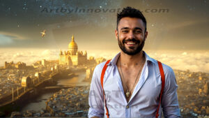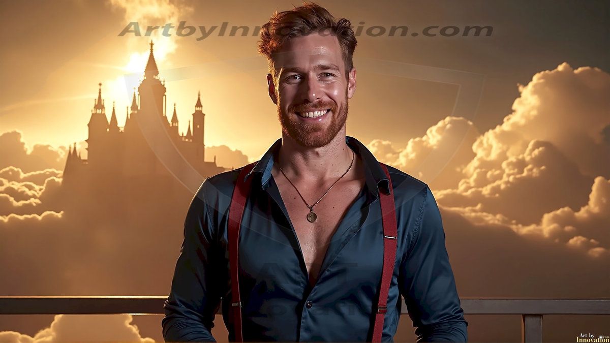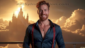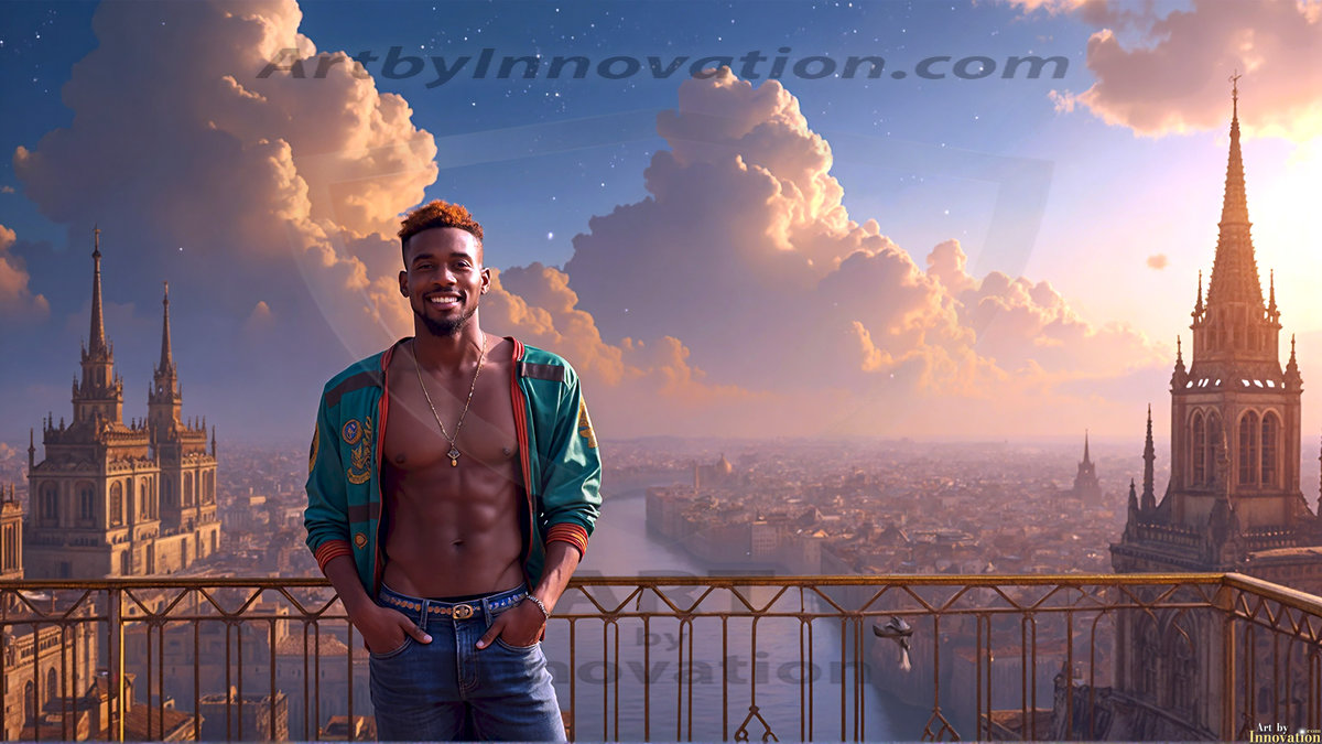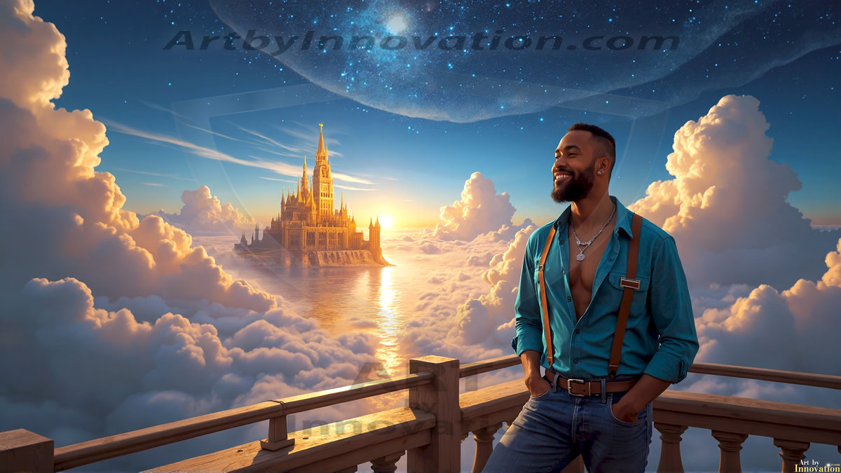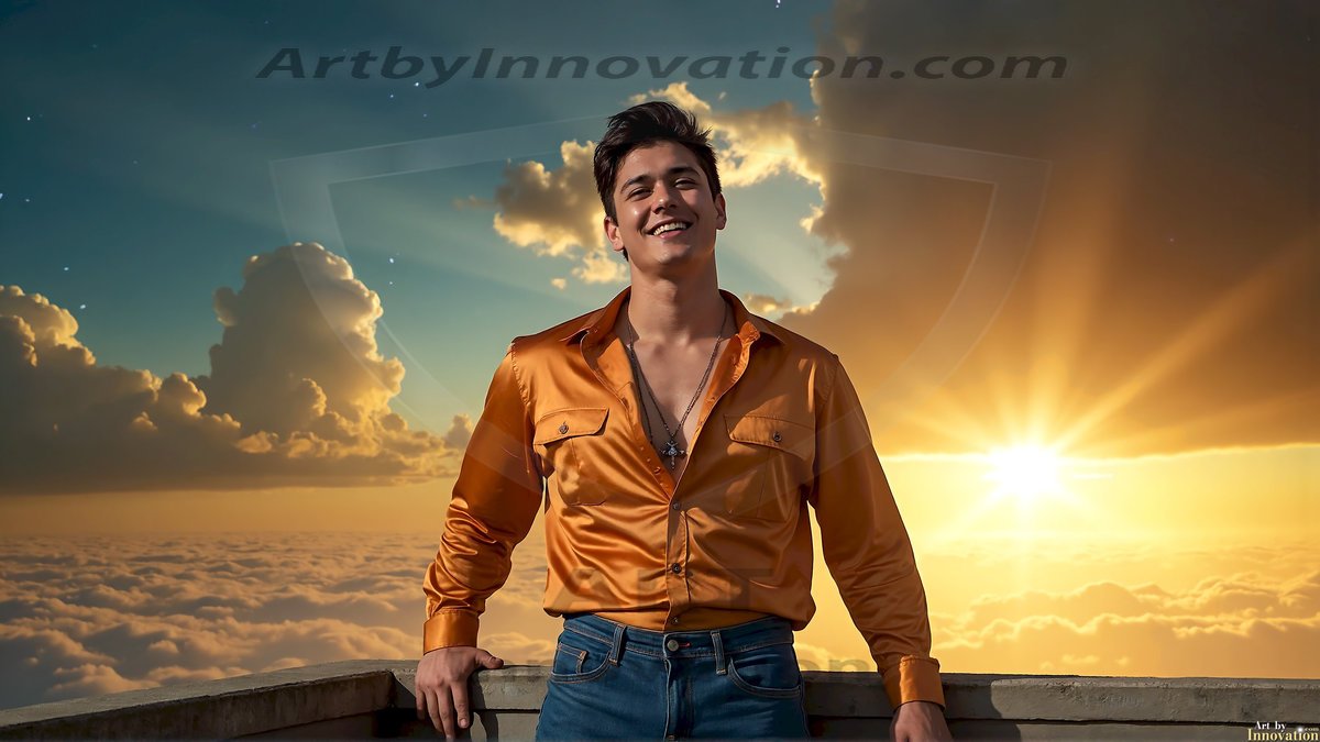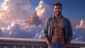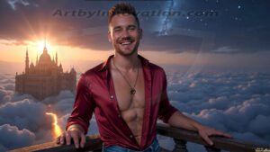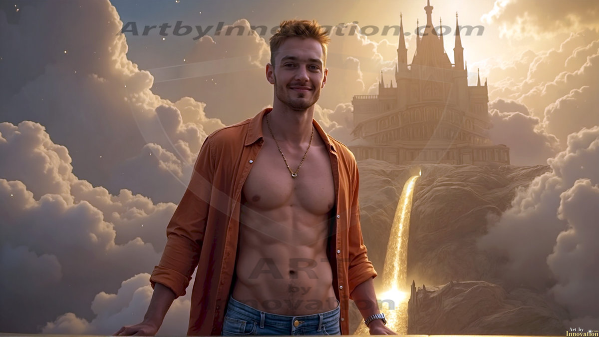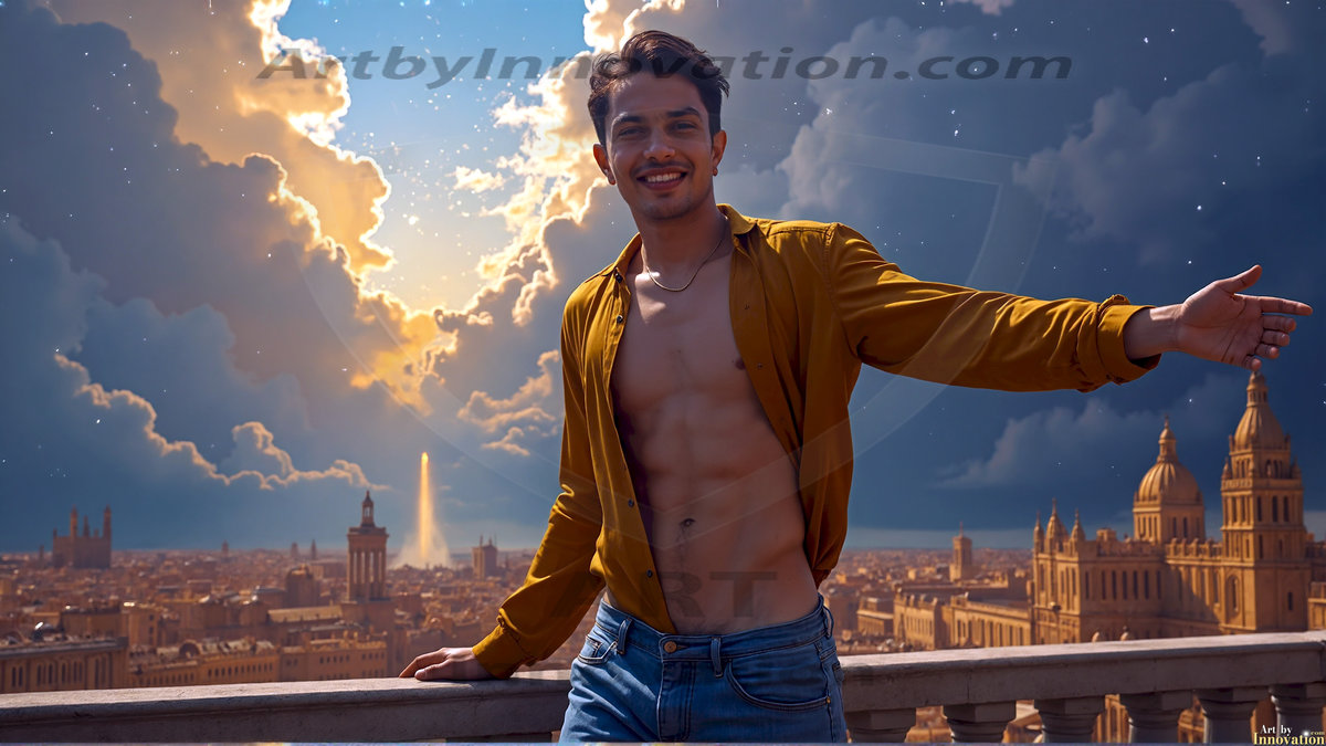 The Beautiful Young Men of the Golden City, is a collection of AI generated images of sexy, glamorous, handsome guys in the heavens. In this fantasy photograph of a young men in their 20’s, on a balcony, overlooking a large golden city in the heavens. Generated to be as realistic as possible, in this this fantasy setting, with todays technology. Wearing jeans, an unbuttoned, vibrant, long-sleeve, button down shirt. The subject is enjoying a beautiful day outdoors. The mystical, galactic landscape, and the vibrant cosmic canopies, every detail, from the texture of the clouds, to the magnificent, majestic gothic architecture of the golden city, is crafted to create an atmosphere of reverence and divine glory. With a breathtaking scene of Salar de Uyuni at sunset, offering warm golden hour lighting. The heavenly landscape evokes a sense of freedom and tranquility, that is expresses through his facial features and smile, as day turns to night. The heavenly landscape evokes a sense of mysterious black space and light, with a vast galaxy that almost covers the image, the stars and constellations sparkle bright, in dark blue sky. On occasion the earth can be seen floating in the sky.