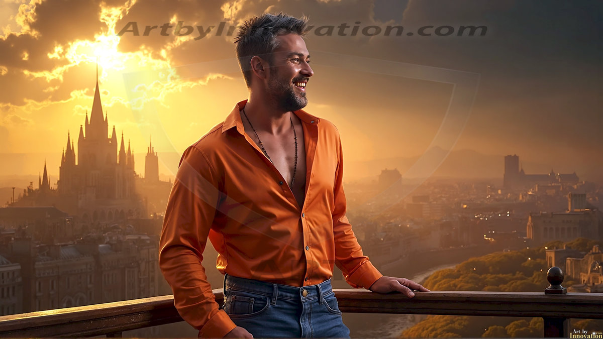 The Beautiful & Handsome Men of the Golden City, is a collection of AI generated images of sexy, glamorous, handsome guys in the heavens. In this fantasy photograph of a young men in their 30’s and 40’s, on a balcony, overlooking a large golden city in the heavens. Generated to be as realistic as possible, in this this fantasy setting, with todays technology. Wearing jeans, an unbuttoned, vibrant, long-sleeve, button down shirt. The subject is enjoying a beautiful day outdoors. The mystical, galactic landscape, and the vibrant cosmic canopies, every detail, from the texture of the clouds, to the magnificent, majestic gothic architecture of the golden city, is crafted to create an atmosphere of reverence and divine glory. With a breathtaking scene of Salar de Uyuni at sunset, offering warm golden hour lighting. The heavenly landscape evokes a sense of freedom and tranquility, that is expresses through his facial features and smile, as day turns to night. The heavenly landscape evokes a sense of mysterious black space and light, with a vast galaxy that almost covers the image, the stars and constellations sparkle bright, in dark blue sky. On occasion the earth can be seen floating in the sky.