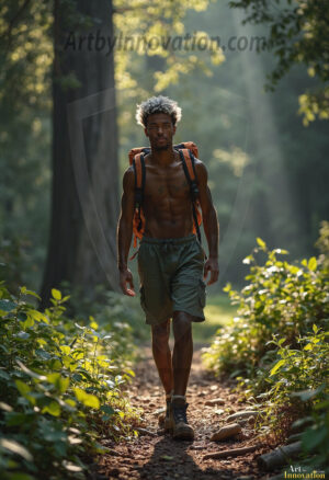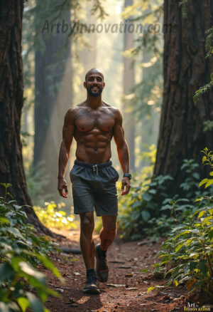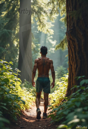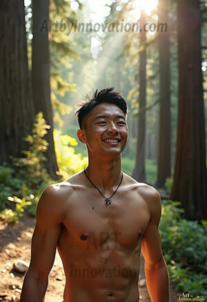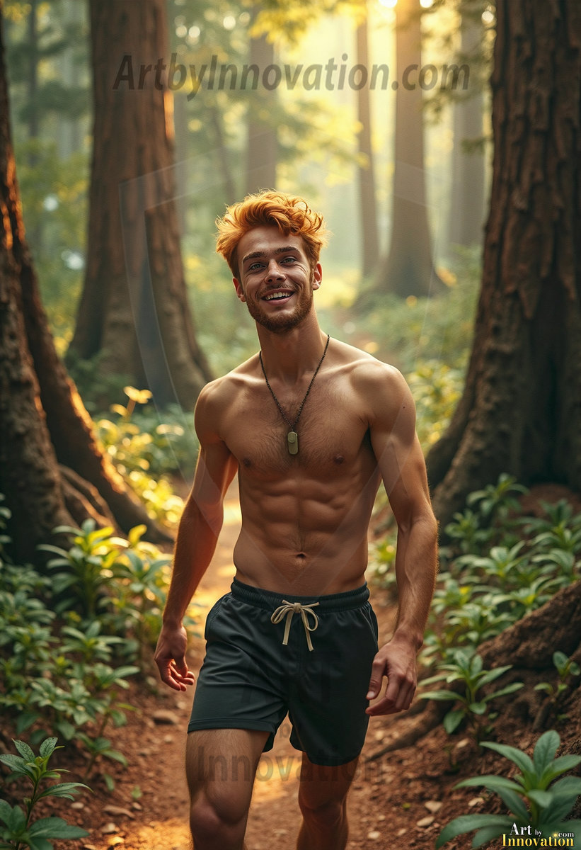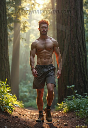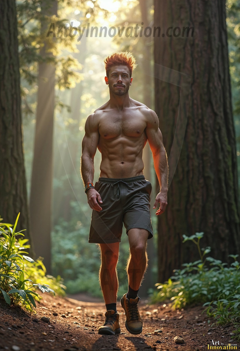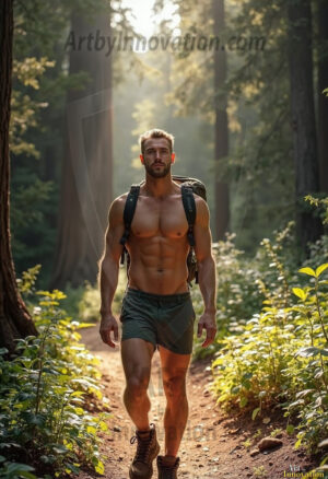 Into the wild. This AI-generated collection features beautiful, handsome, shirtless men hiking trails through stunning redwood forests — sweaty, muscular, and breathtakingly real. Crepuscular rays break through the forest canopy as these hot, confident men stride through nature in their element. Combining photorealistic skin texture with cinematic lighting, each image is a masterclass in male beauty and the great outdoors. Created using Flux.1 and ComfyUI by © Jeff Dupler | Art by Innovation | https://www.artbyinnovation.com