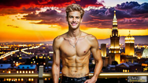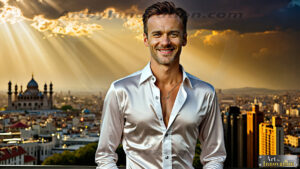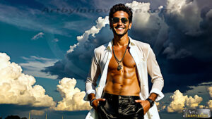 AI-generated abstract art — handsome men emerging from classic oil painting canvases, art imitating life in stunning surreal imagery.