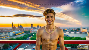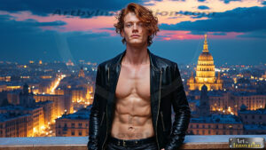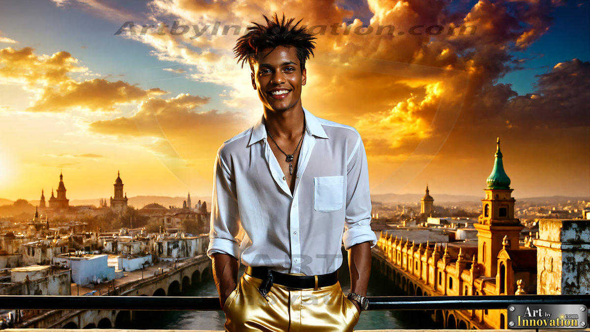 Handsome AI-generated men overlooking a majestic golden city in the heavens — gothic architecture, galactic skies, divine glory.