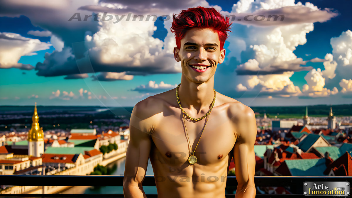 AI-generated abstract art — hot handsome men covered in colorful body paint explosions, full of joy and rainbow color.