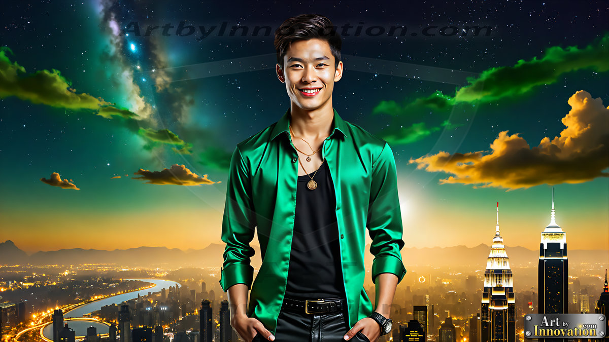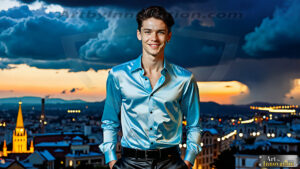 Handsome AI-generated men overlooking a majestic golden city in the heavens — gothic architecture, galactic skies, divine glory.