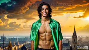 AI-generated LGBTQ Pride art — beautiful handsome men embellished with the vibrant rainbow colors of the gay pride flag. 500+ images.