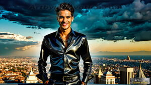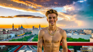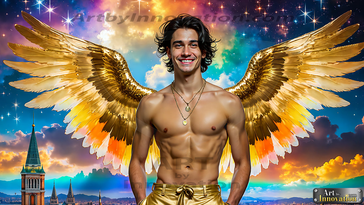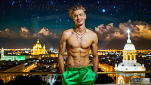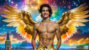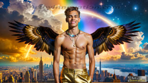 AI-generated LGBTQ Pride art — beautiful handsome men embellished with the vibrant rainbow colors of the gay pride flag. 500+ images.