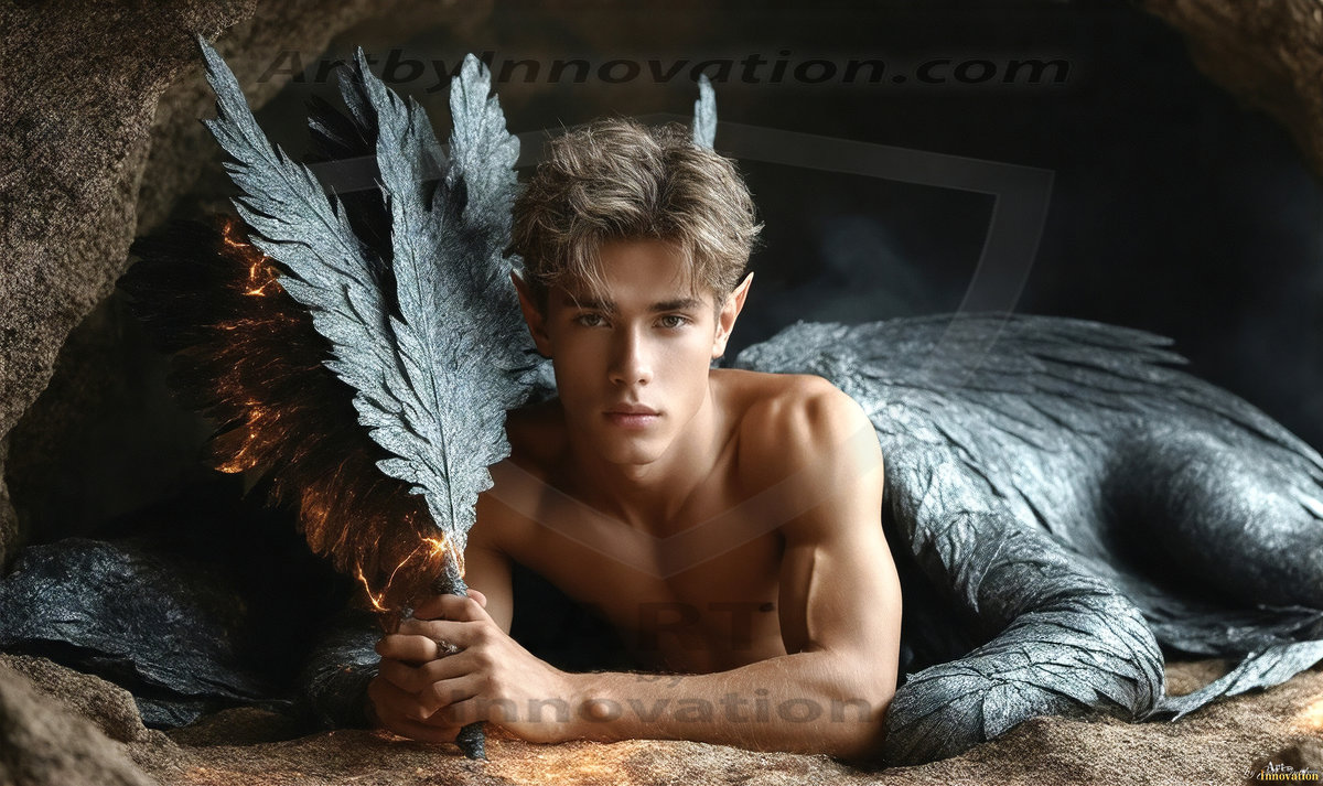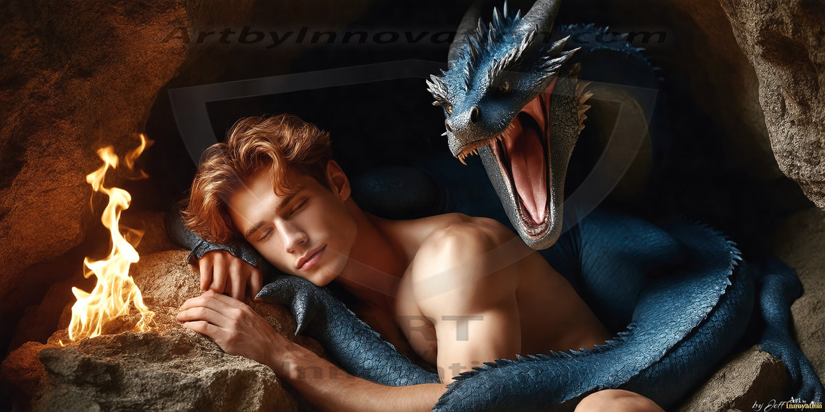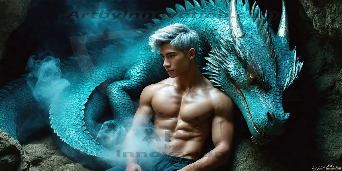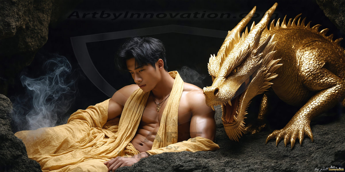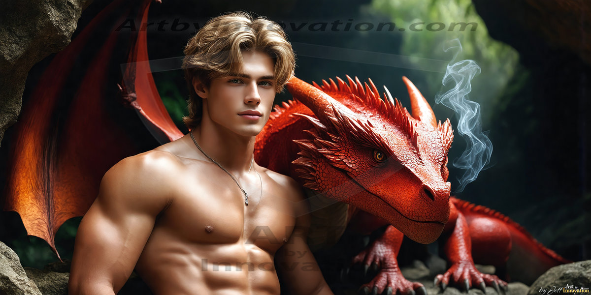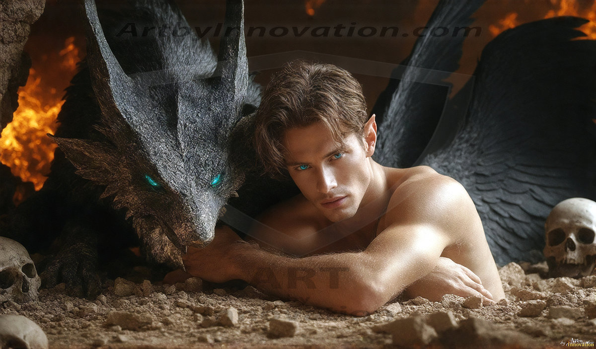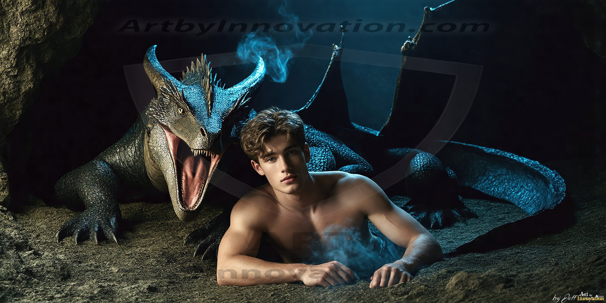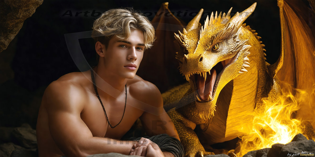 Standing before you is a prince and his dragon. This AI-generated collection features handsome, shirtless young princes with muscular physiques alongside their magnificent dragons — from the obsidian-scaled Bahamut with silver wings, to golden dragons sleeping in ancient caves. Each image blends the beauty of the male form with the raw majesty of dragonkind, set against breathtaking fantasy backdrops. Created using Flux.1, ComfyUI, Stable Diffusion, and refined with Adobe Photoshop by © Jeff Dupler | Art by Innovation | https://www.artbyinnovation.com