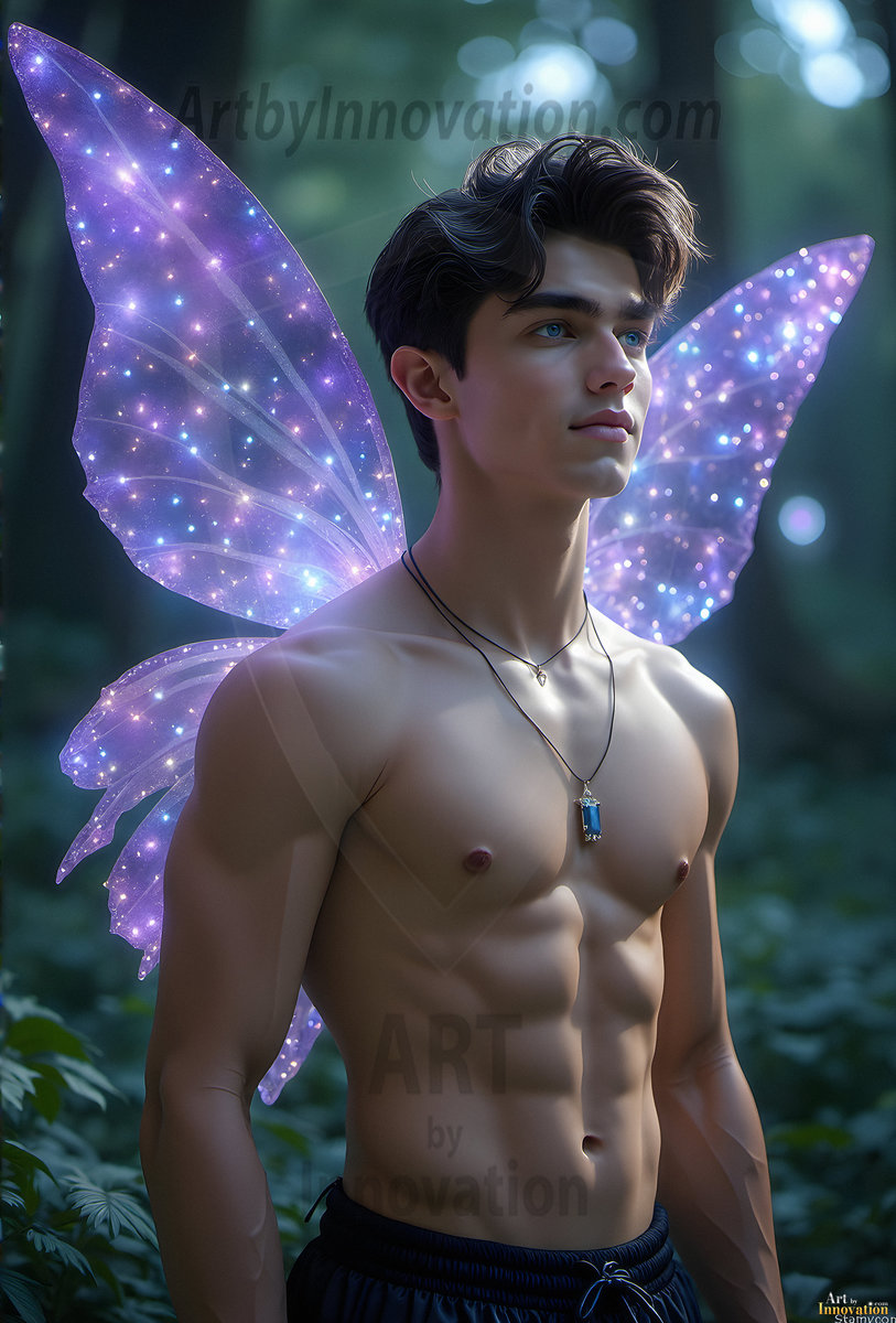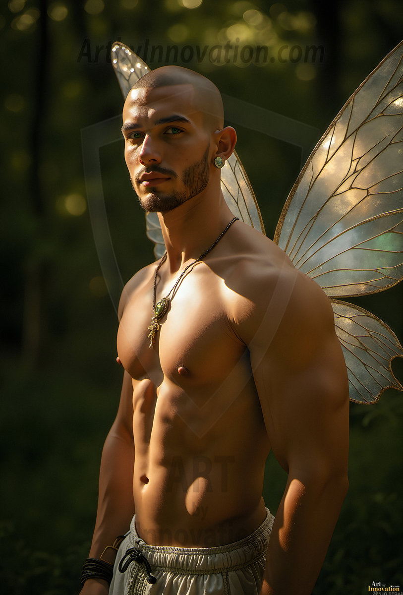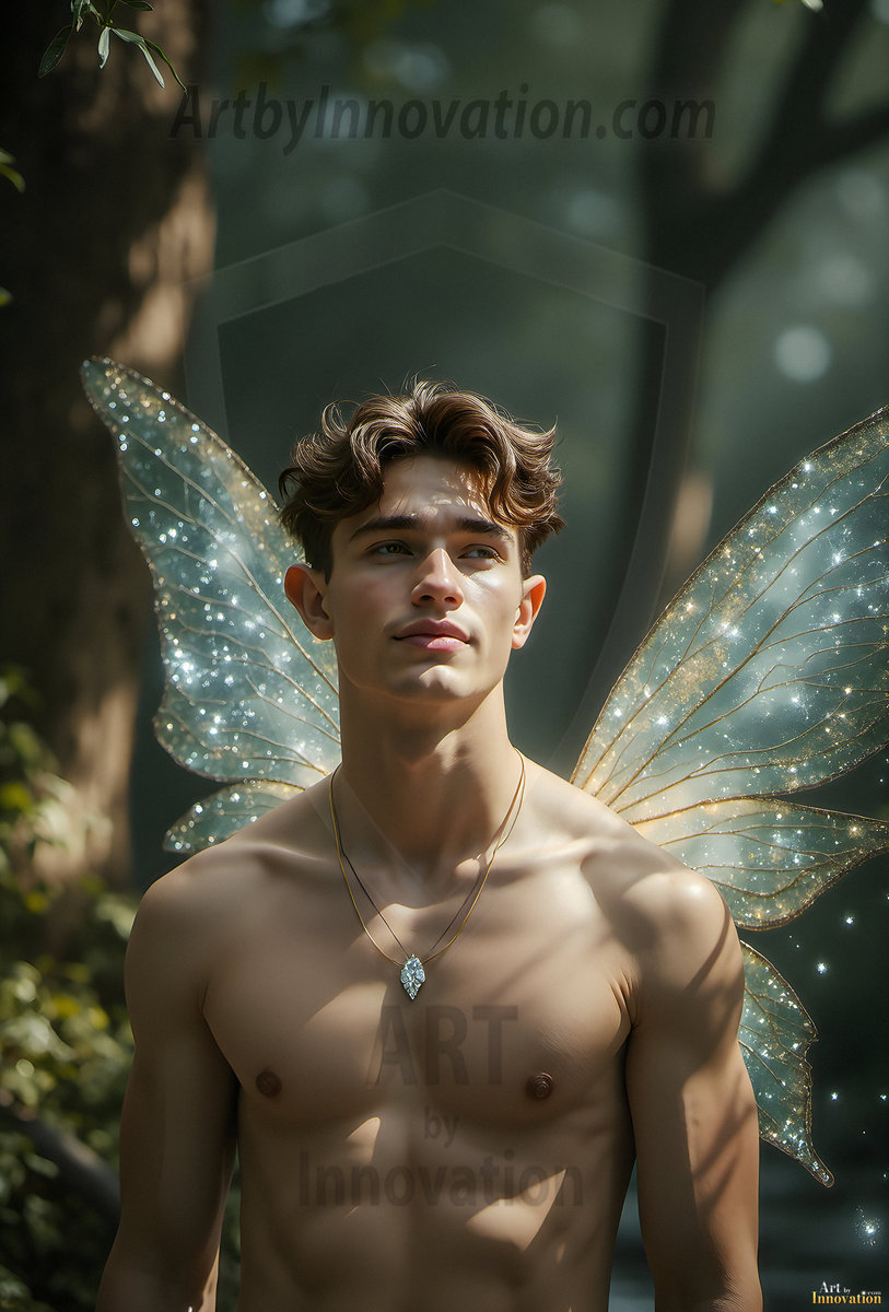 Capturing the pristine and elusive male fairy — brought to life through the power of AI. Imagine a realm where handsome young men possess enormous shimmering crystal wings, vibrant and radiant, capturing and reflecting the light of the environment in a mesmerizing way. Set in mysterious enchanted forests, each fairy exudes an otherworldly beauty and elegance that blurs the line between fantasy and reality. Created using Flux.1, ComfyUI, and Stable Diffusion by © Jeff Dupler | Art by Innovation | https://www.artbyinnovation.com