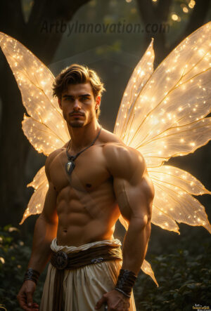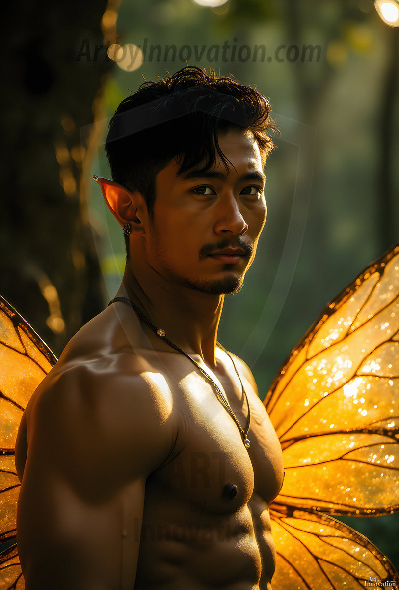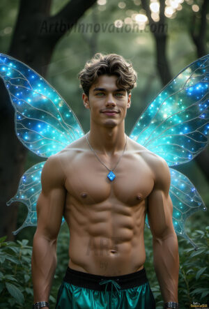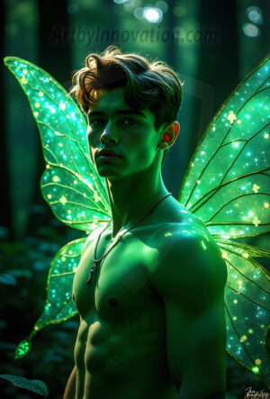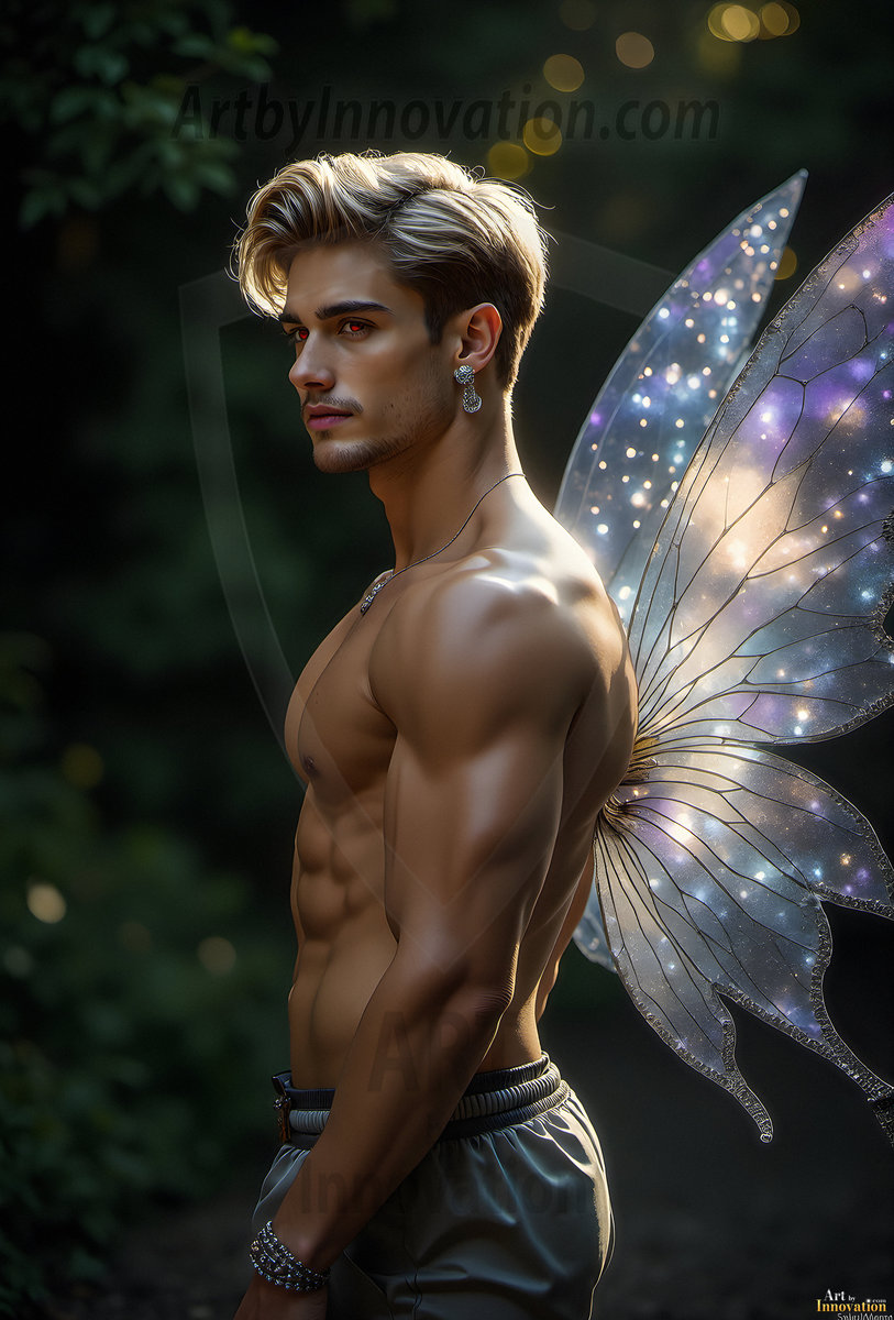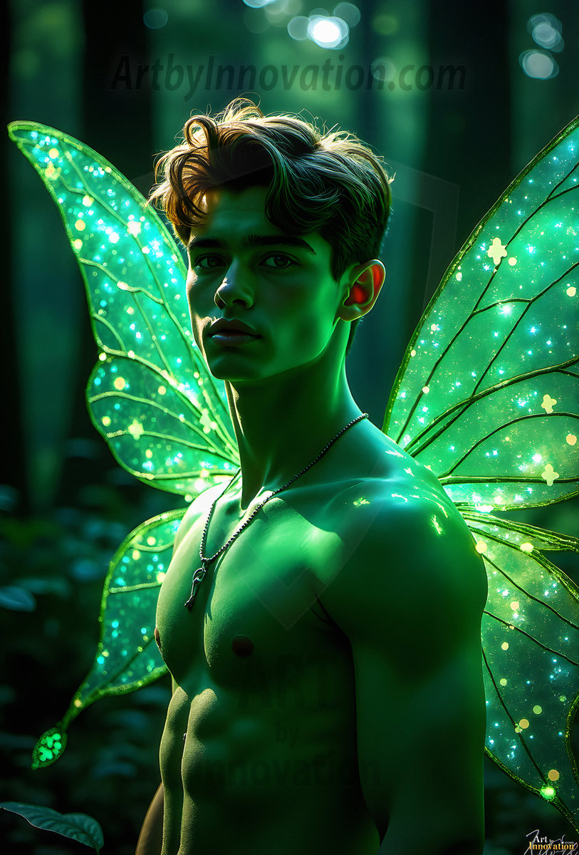 Capturing the pristine and elusive male fairy — brought to life through the power of AI. Imagine a realm where handsome young men possess enormous shimmering crystal wings, vibrant and radiant, capturing and reflecting the light of the environment in a mesmerizing way. Set in mysterious enchanted forests, each fairy exudes an otherworldly beauty and elegance that blurs the line between fantasy and reality. Created using Flux.1, ComfyUI, and Stable Diffusion by © Jeff Dupler | Art by Innovation | https://www.artbyinnovation.com
