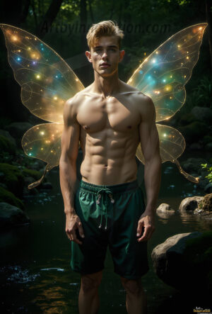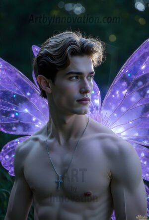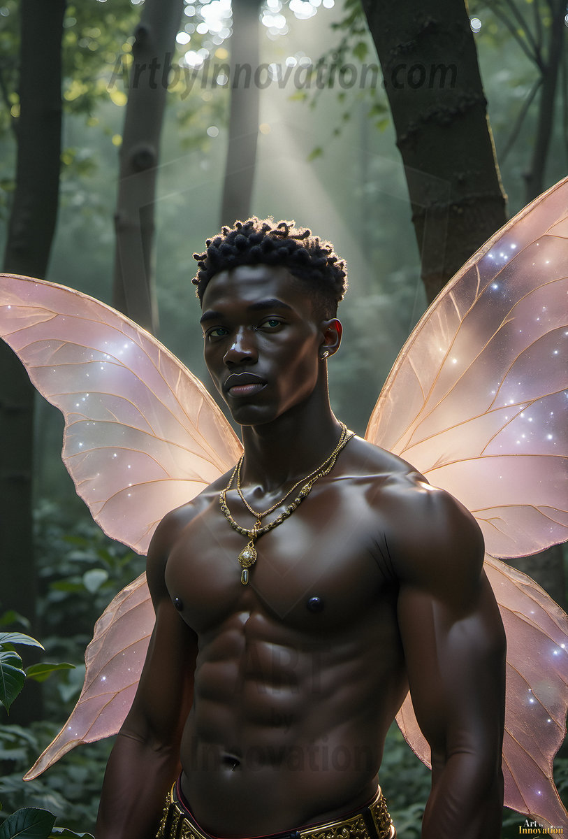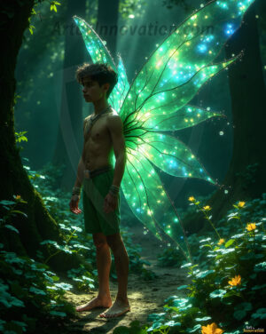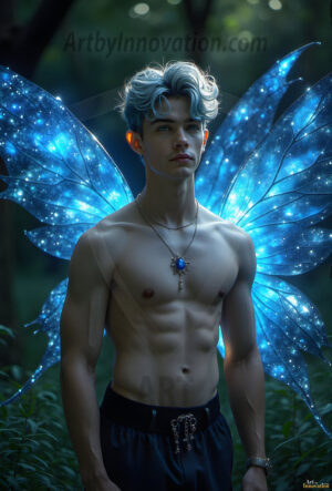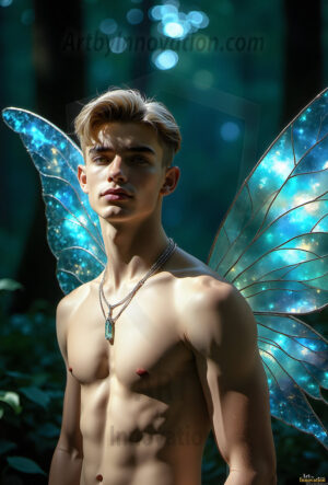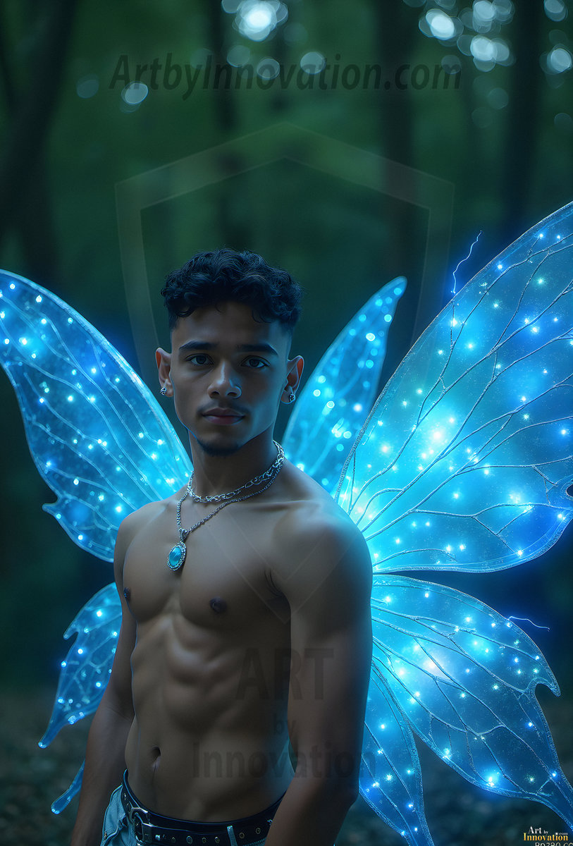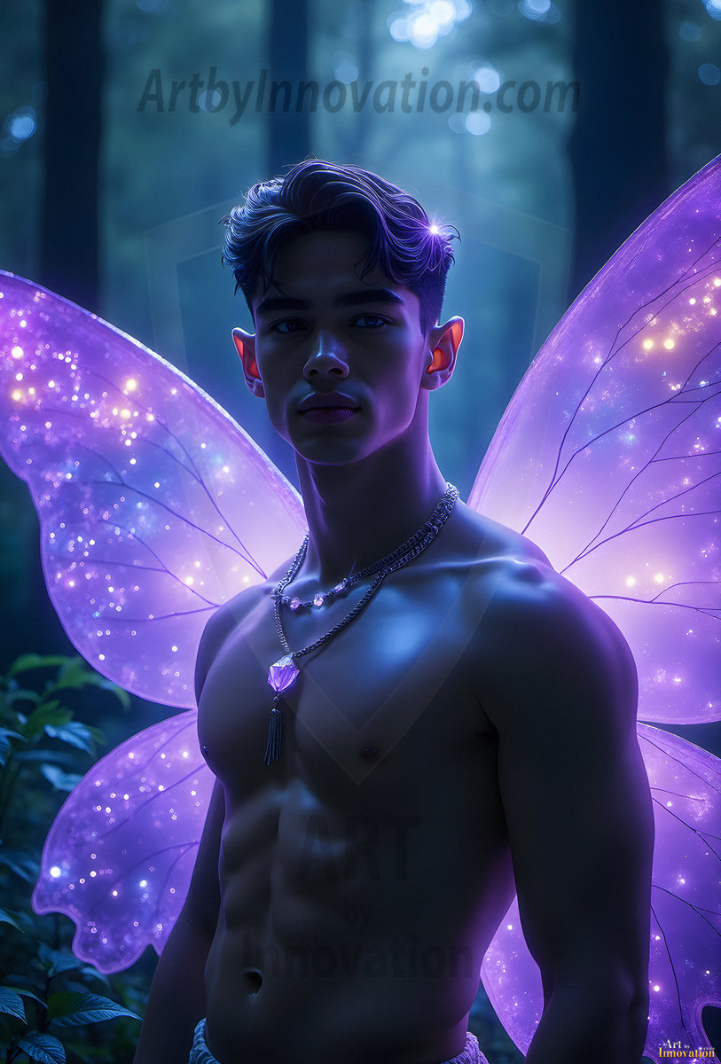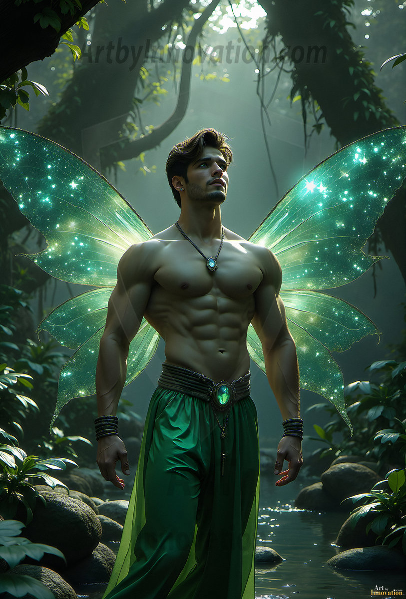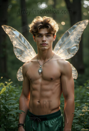 Capturing the pristine and elusive male fairy — brought to life through the power of AI. Imagine a realm where handsome young men possess enormous shimmering crystal wings, vibrant and radiant, capturing and reflecting the light of the environment in a mesmerizing way. Set in mysterious enchanted forests, each fairy exudes an otherworldly beauty and elegance that blurs the line between fantasy and reality. Created using Flux.1, ComfyUI, and Stable Diffusion by © Jeff Dupler | Art by Innovation | https://www.artbyinnovation.com