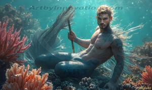 Rise from the depths with the Warriors of the Sea. This AI-generated mermen art collection features handsome warriors from all walks of life — shirtless men with shimmering obsidian fish tails, tridents in hand, set against stormy ocean backdrops and breathtaking vibrant coral reefs. Featuring diverse body types and ethnicities, from lean and athletic to powerfully muscular, each image captures the raw beauty and fierce power of the male merman. Created using Flux.1, Midjourney, ComfyUI, and refined with Adobe Photoshop by © Jeff Dupler | Art by Innovation | https://www.artbyinnovation.com