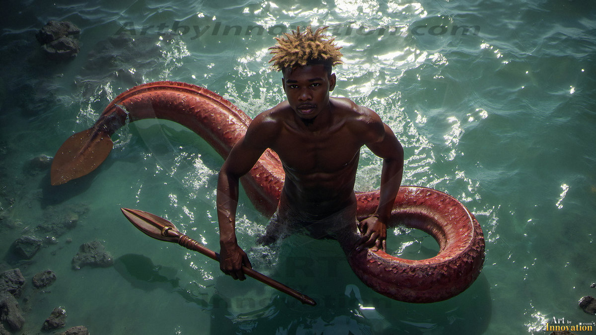 Rise from the depths with the Warriors of the Sea. This AI-generated mermen art collection features handsome warriors from all walks of life — shirtless men with shimmering obsidian fish tails, tridents in hand, set against stormy ocean backdrops and breathtaking vibrant coral reefs. Featuring diverse body types and ethnicities, from lean and athletic to powerfully muscular, each image captures the raw beauty and fierce power of the male merman. Created using Flux.1, Midjourney, ComfyUI, and refined with Adobe Photoshop by © Jeff Dupler | Art by Innovation | https://www.artbyinnovation.com