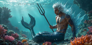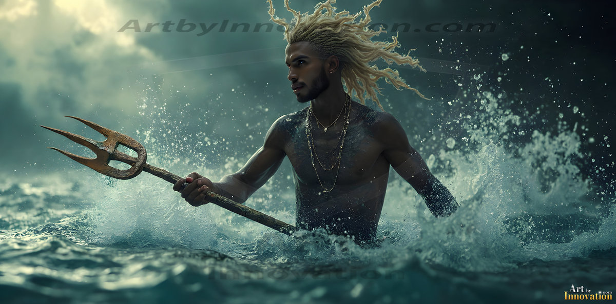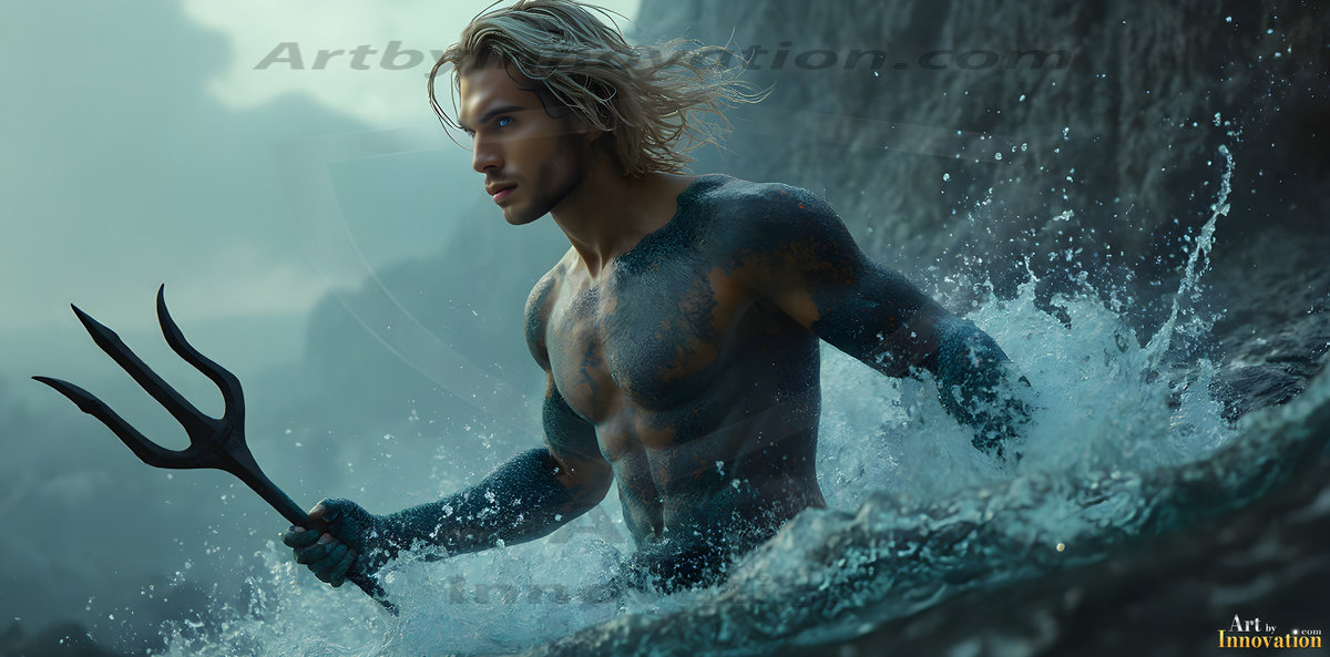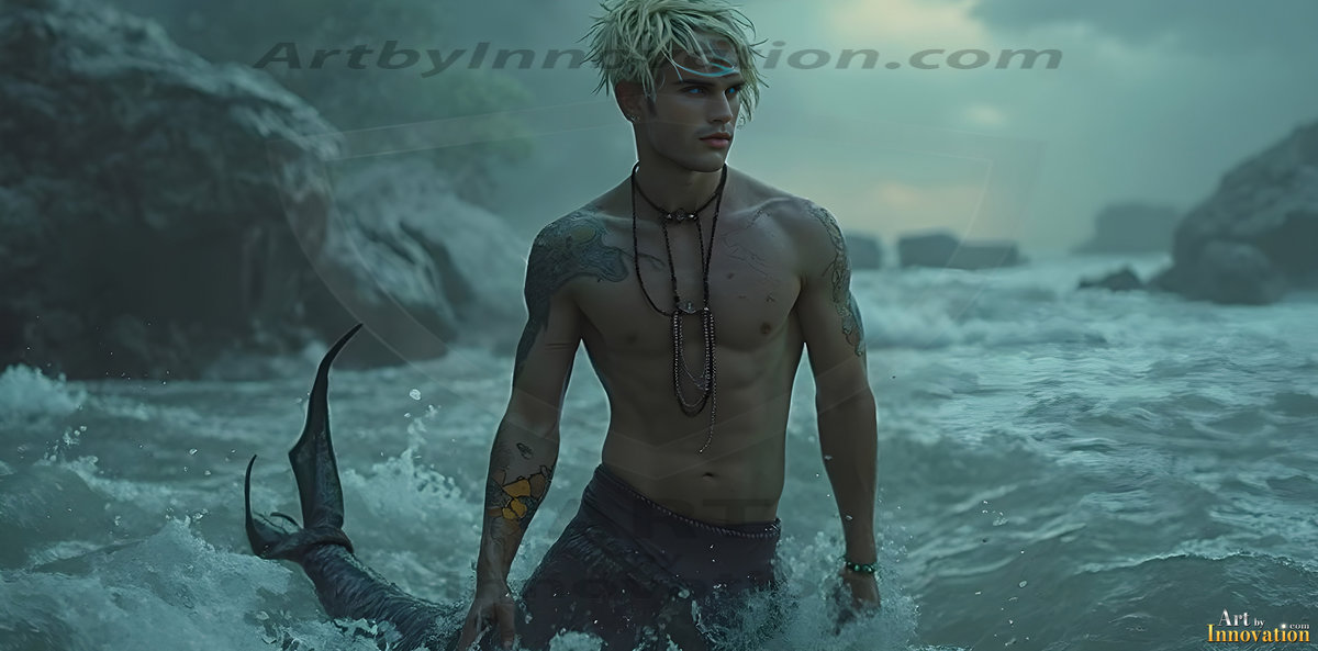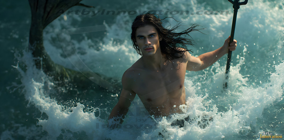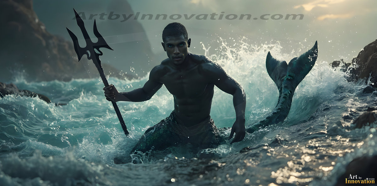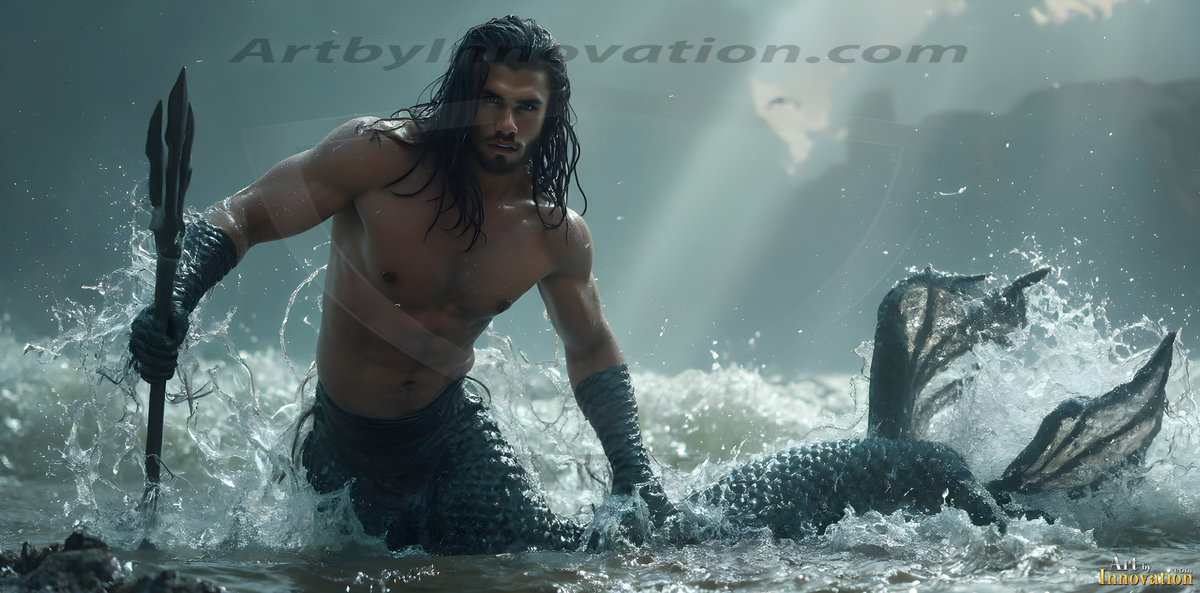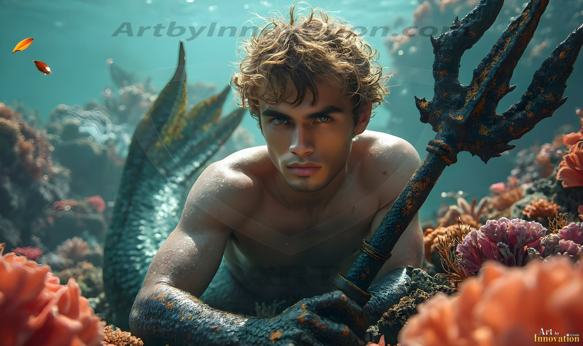 Rise from the depths with the Warriors of the Sea. This AI-generated mermen art collection features handsome warriors from all walks of life — shirtless men with shimmering obsidian fish tails, tridents in hand, set against stormy ocean backdrops and breathtaking vibrant coral reefs. Featuring diverse body types and ethnicities, from lean and athletic to powerfully muscular, each image captures the raw beauty and fierce power of the male merman. Created using Flux.1, Midjourney, ComfyUI, and refined with Adobe Photoshop by © Jeff Dupler | Art by Innovation | https://www.artbyinnovation.com