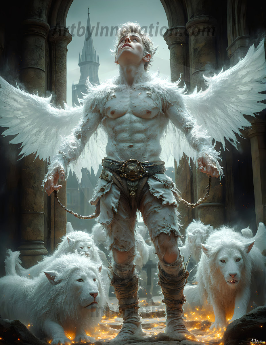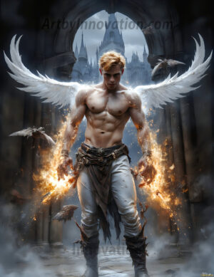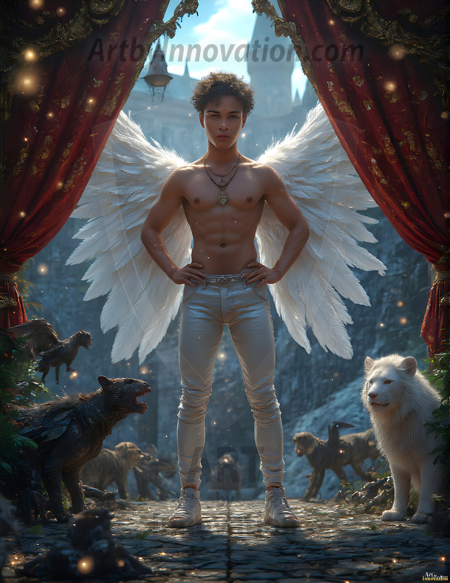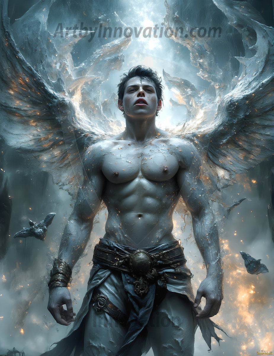 Handsome AI-generated men with magnificent rainbow LGBTQ+ Pride feathered wings — fantasy art celebrating freedom and identity.
