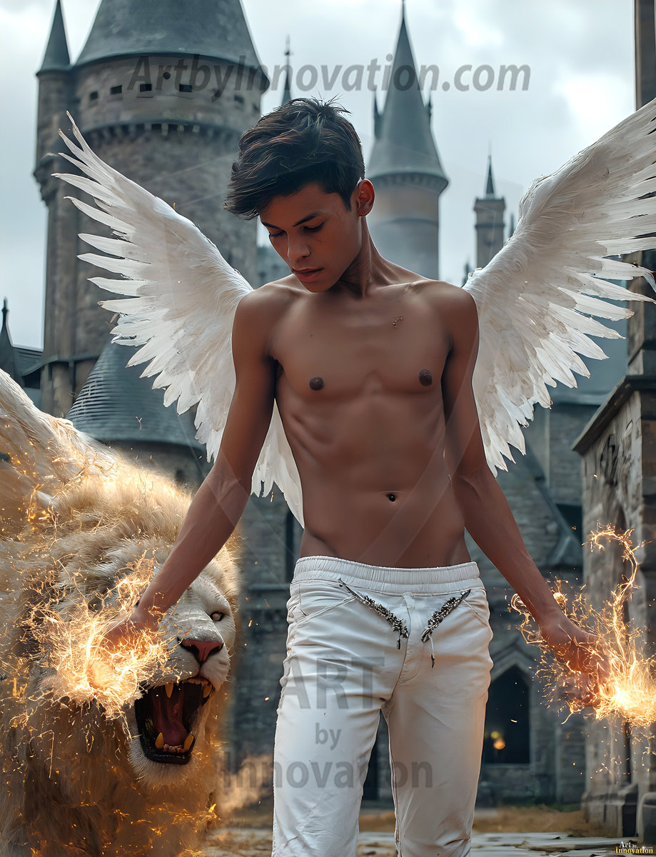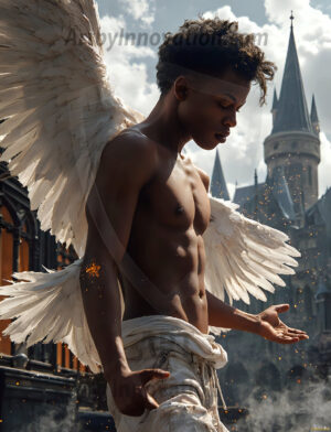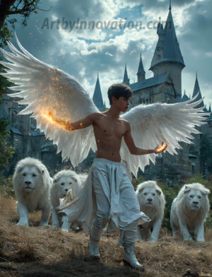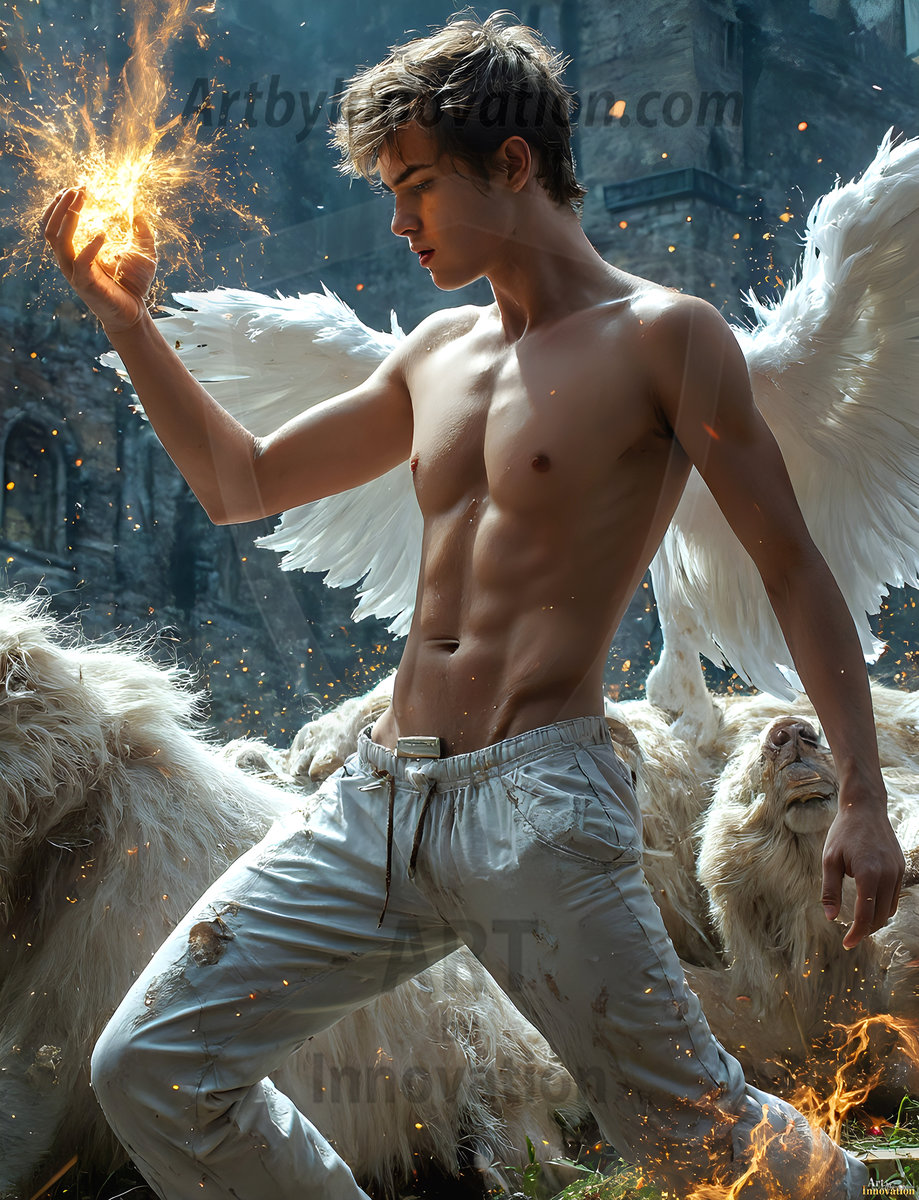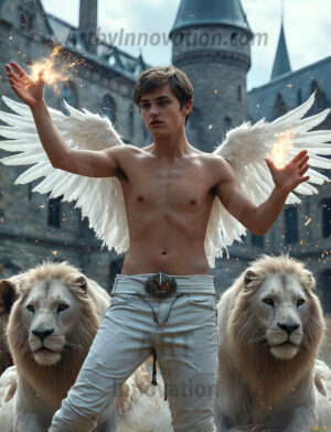 Handsome AI-generated male warrior angels in divine holy armor with vibrant wings — God’s warriors in the golden city of heaven.