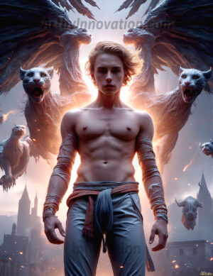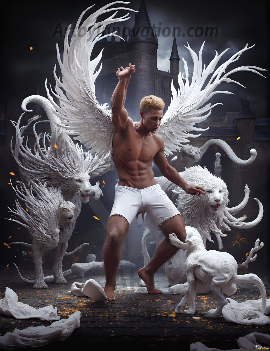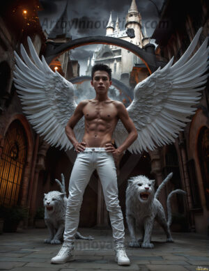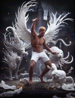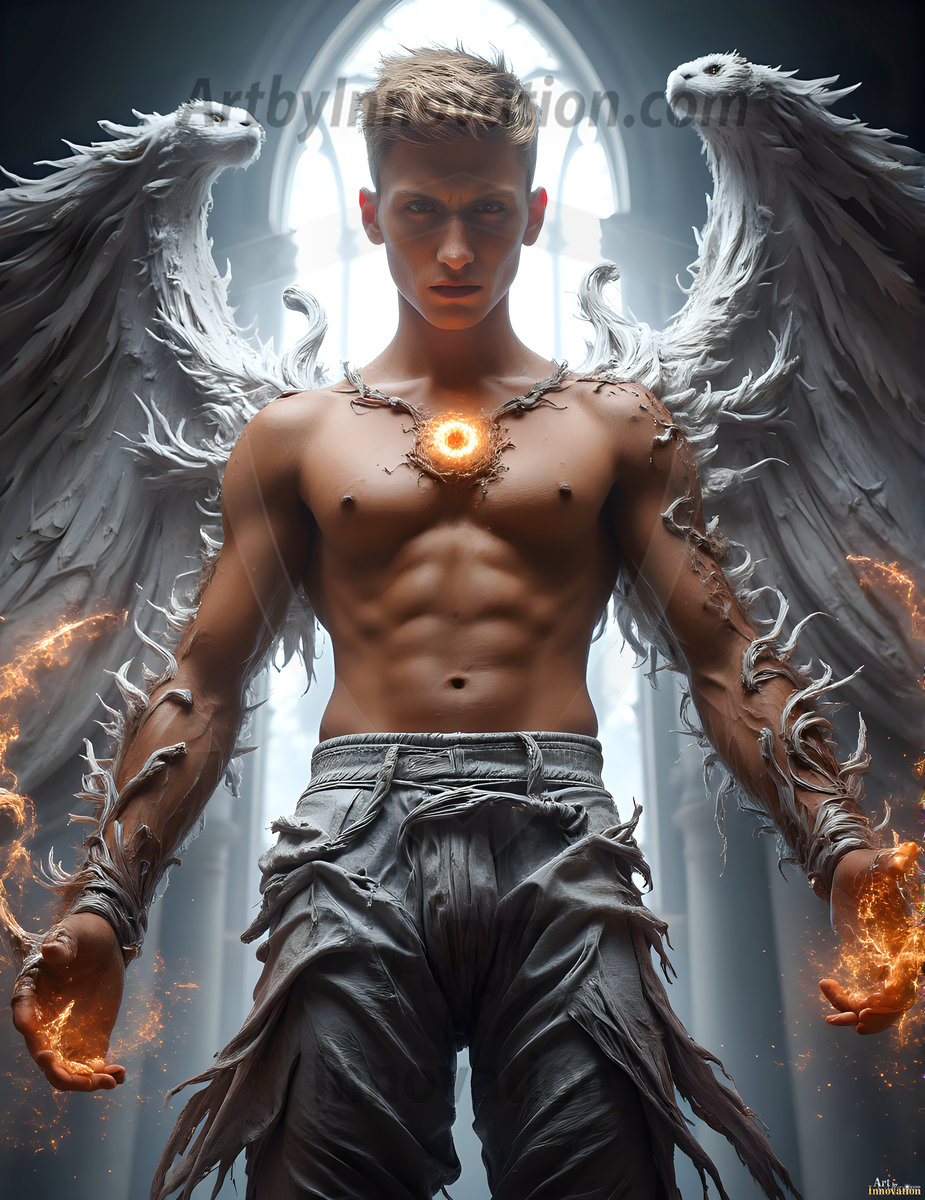 Handsome AI-generated male warrior angels in divine holy armor with vibrant wings — God’s warriors in the golden city of heaven.