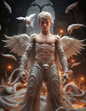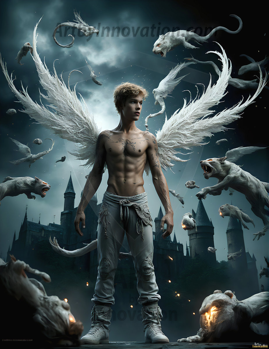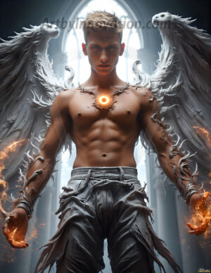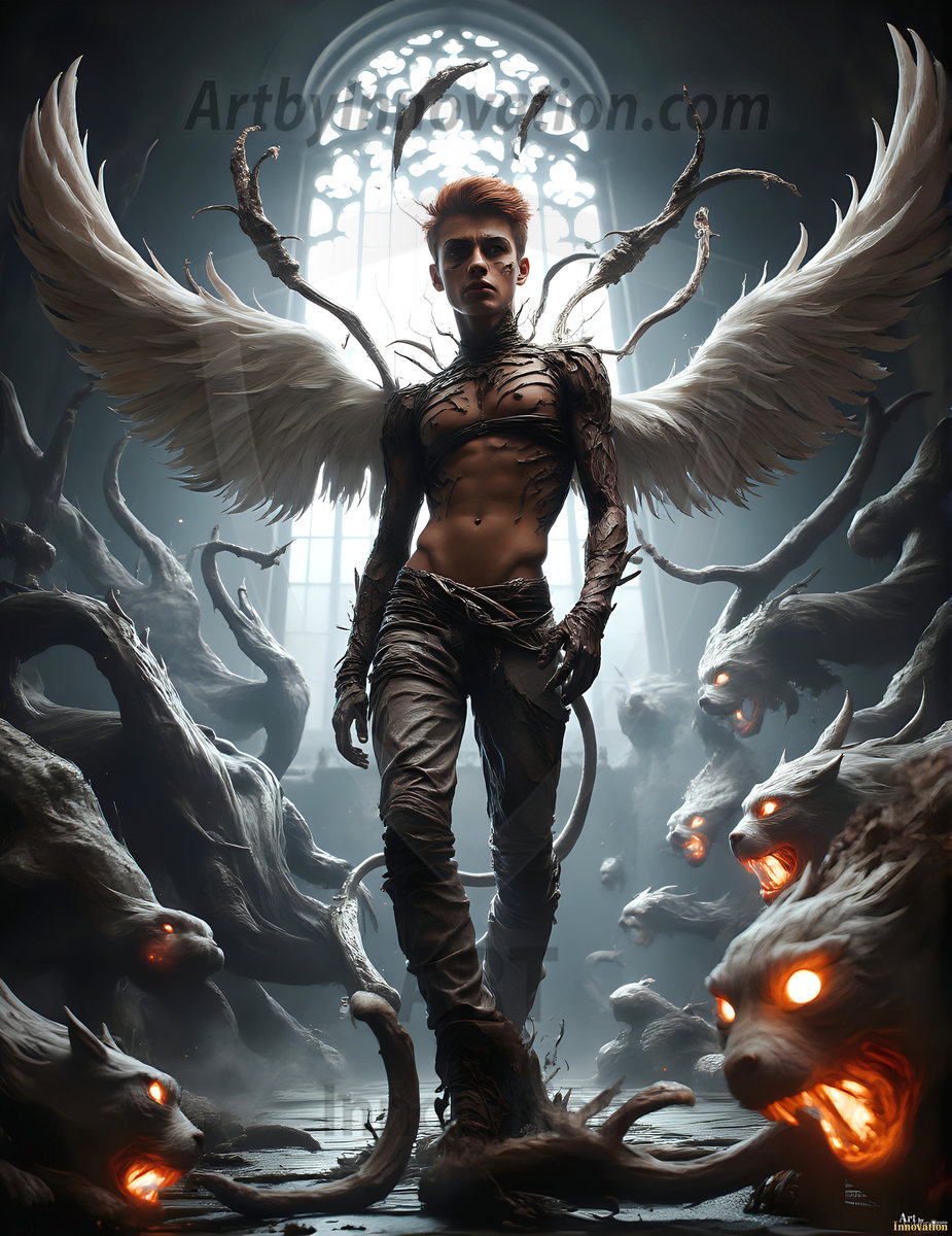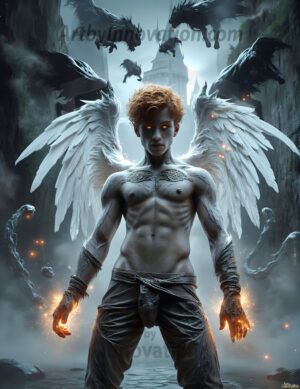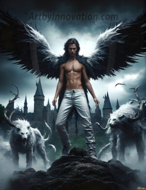 Handsome AI-generated fallen dark angels with massive black and silver wings — gothic beauty and terrifying power.