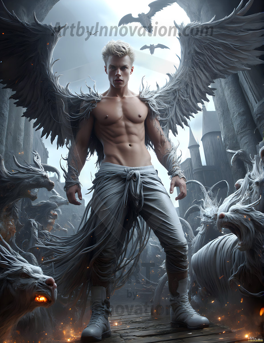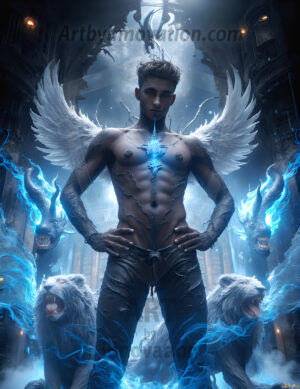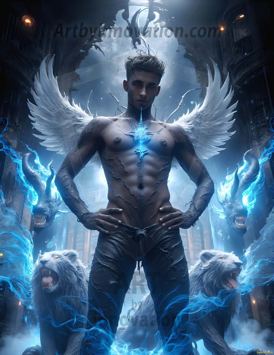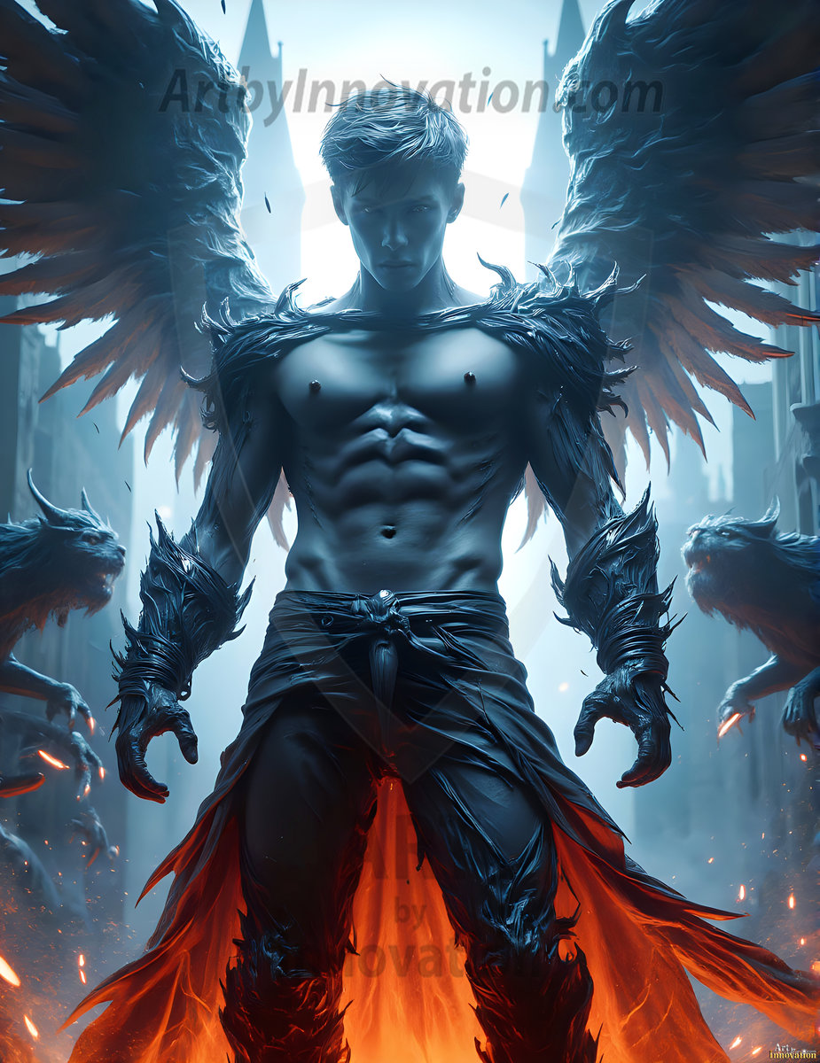 AI-generated hot male demons with dark wings and glowing eyes — handsome, dangerous, and seductive from the ruins of hell.