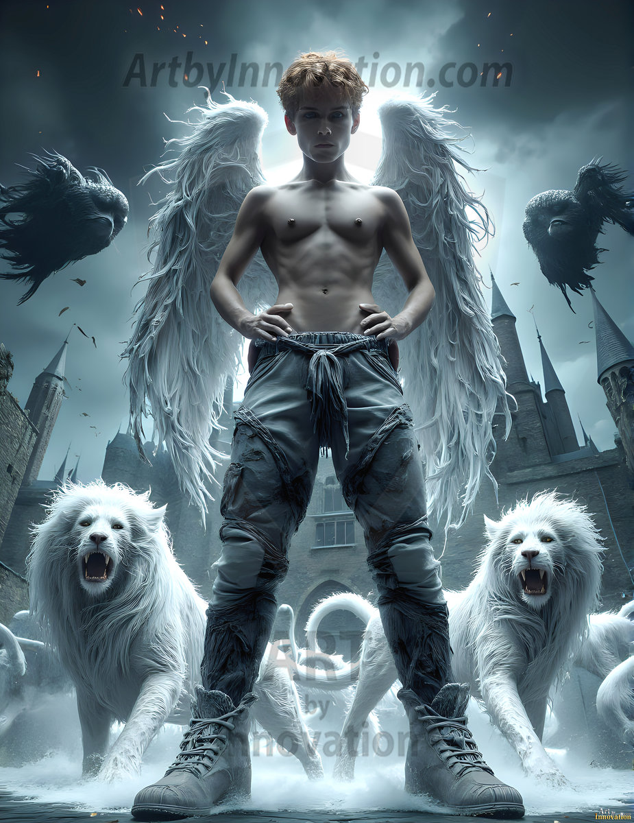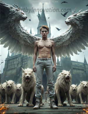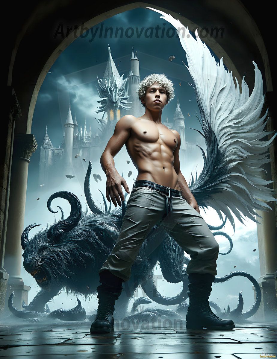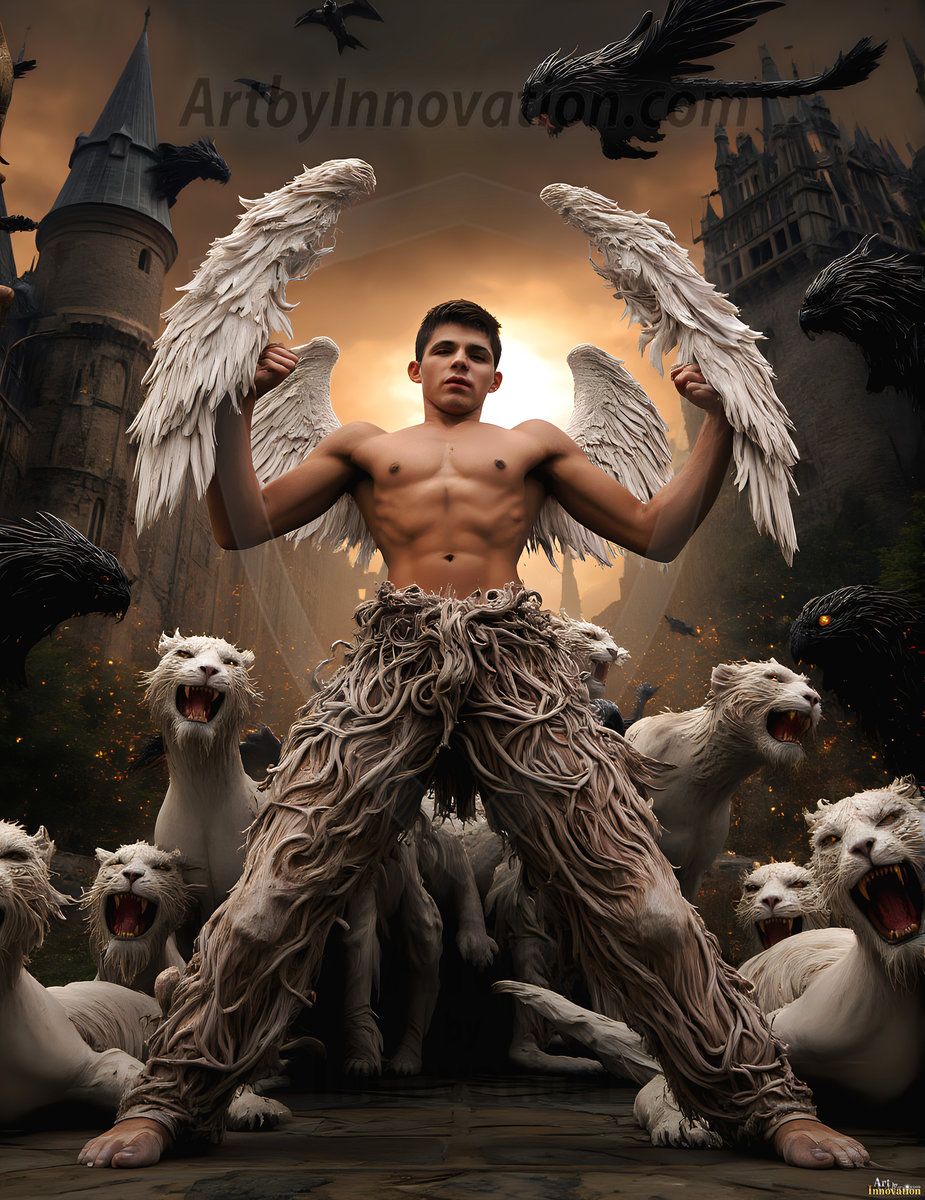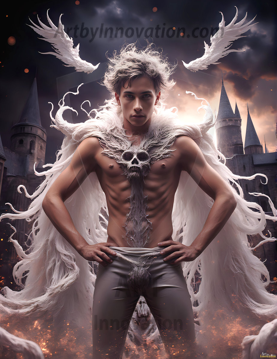 AI-generated hot male demons with dark wings and glowing eyes — handsome, dangerous, and seductive from the ruins of hell.