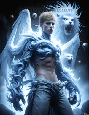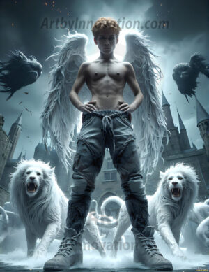Handsome AI-generated male warrior angels in divine holy armor with vibrant wings — God’s warriors in the golden city of heaven.