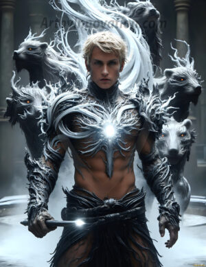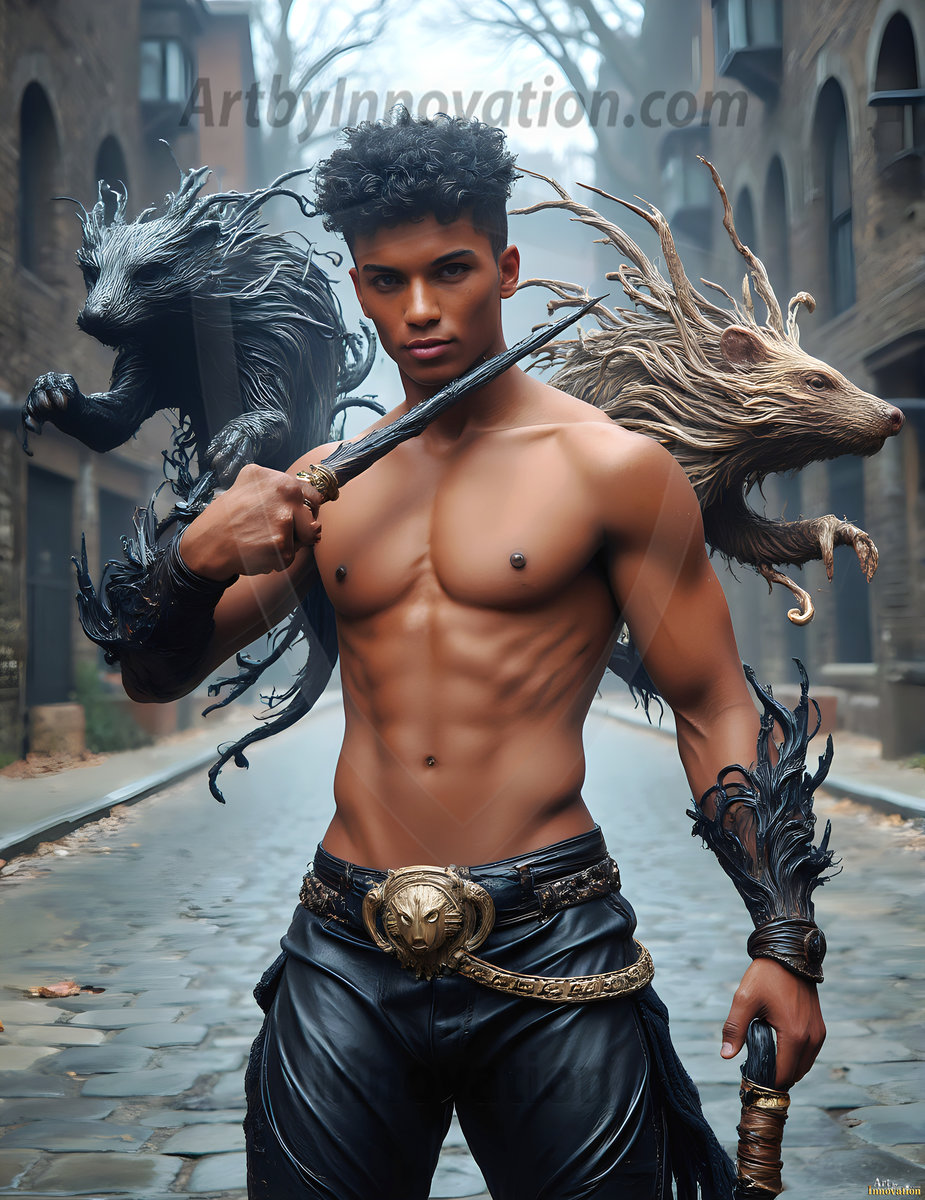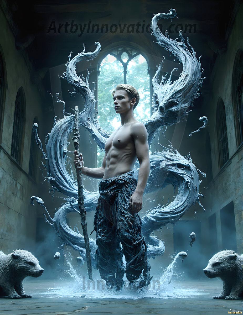 AI-generated abstract art — beautiful handsome men enveloped by swirling vibrant rainbow color clouds and mists.