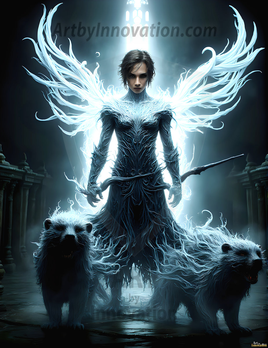AI-generated art of handsome celestial spirits living on the outskirts of a majestic golden heavenly city — gothic architecture and galactic skies.