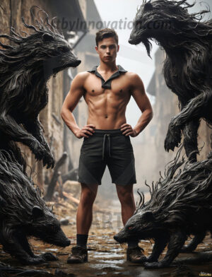 AI-generated abstract art — handsome men dancing as colorful dynamic light rays wrap and swirl around their bodies.