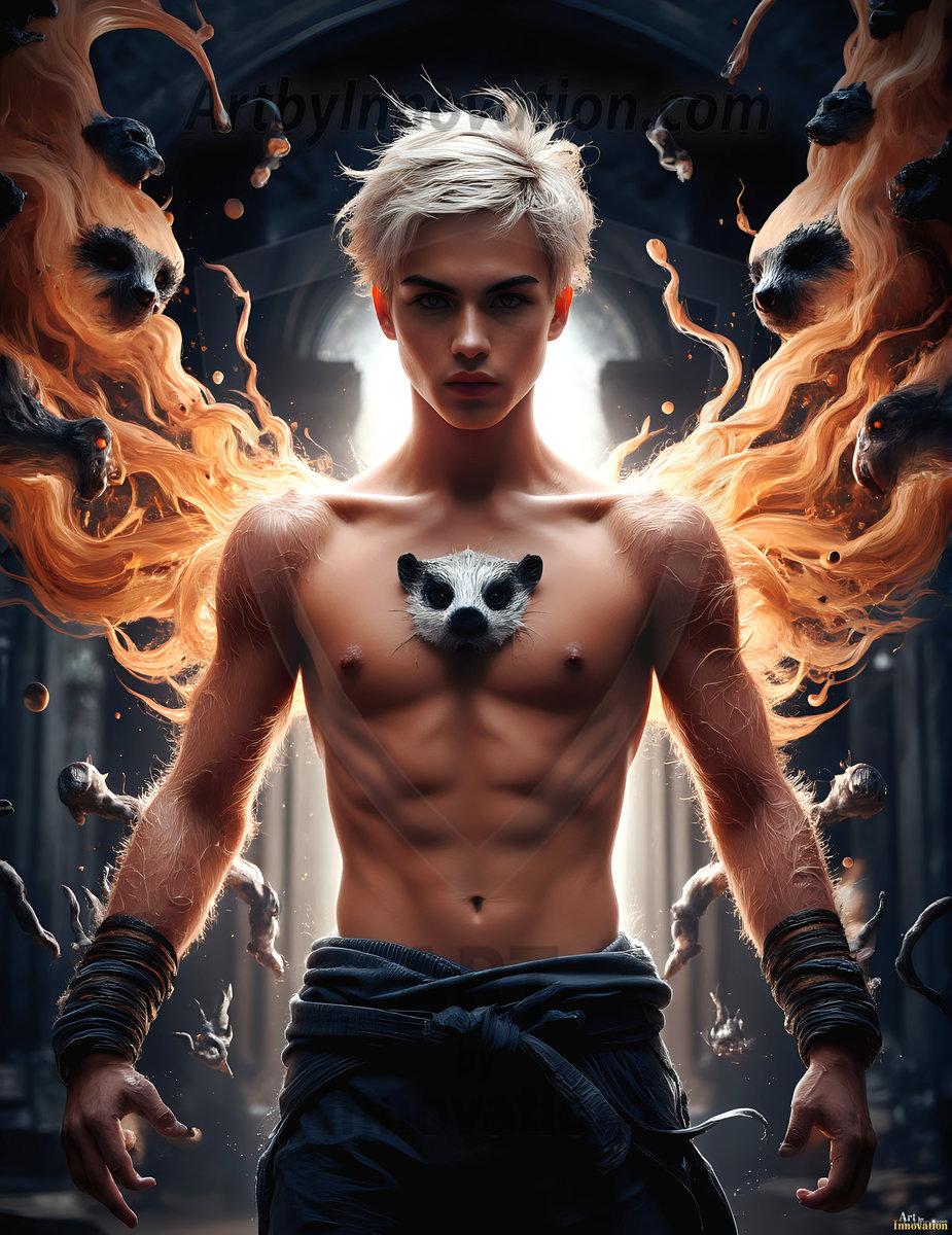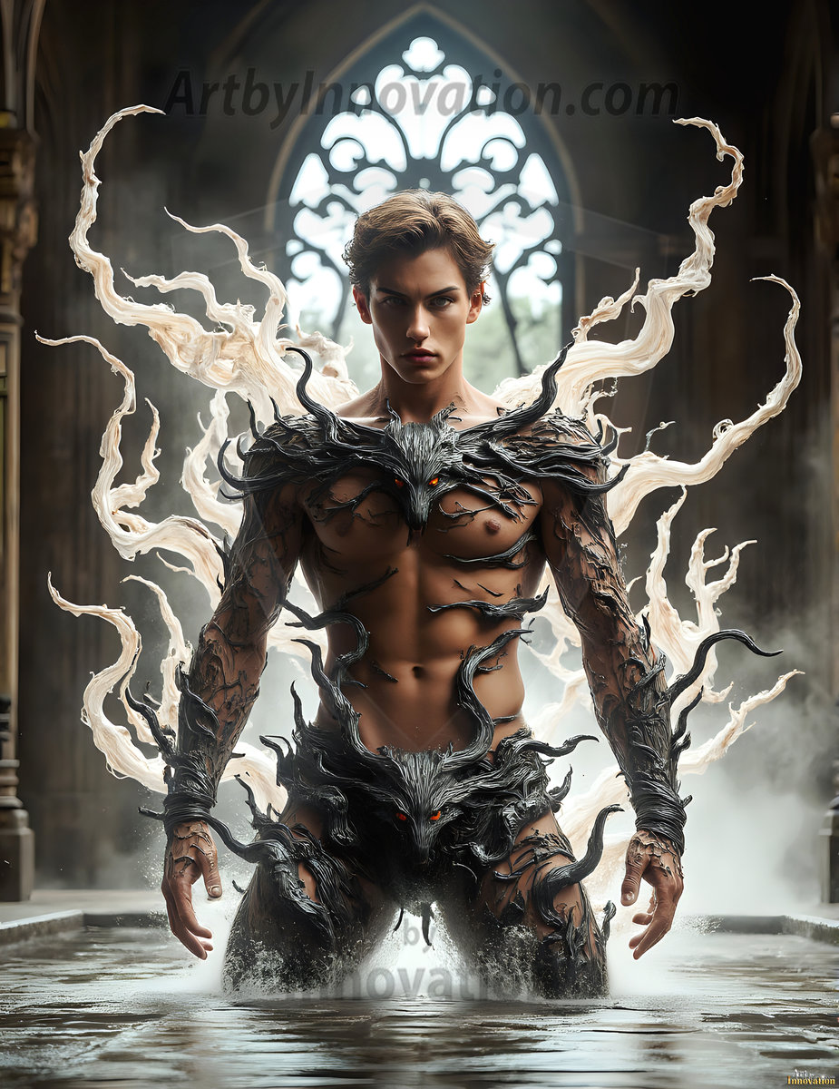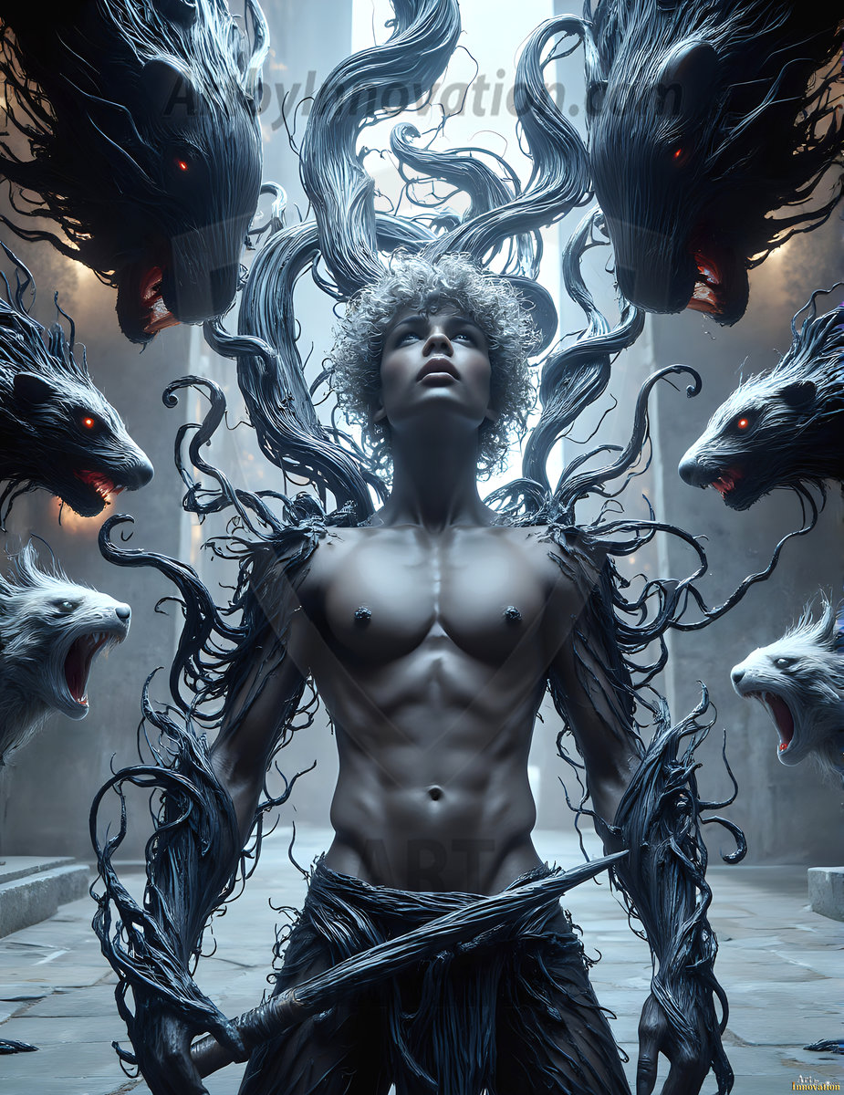 AI-generated abstract art — handsome men dancing as colorful dynamic light rays wrap and swirl around their bodies.