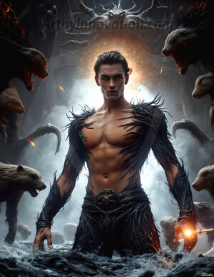 AI-generated art of hot handsome shirtless men hiking through beautiful redwood forests — sweaty, muscular, and cinematic.