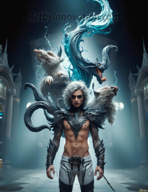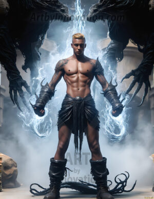 AI-generated mermen warriors with shimmering obsidian scales, tridents, and vibrant coral reef underwater scenes.
