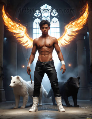 AI-generated art of handsome celestial spirits living on the outskirts of a majestic golden heavenly city — gothic architecture and galactic skies.