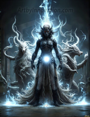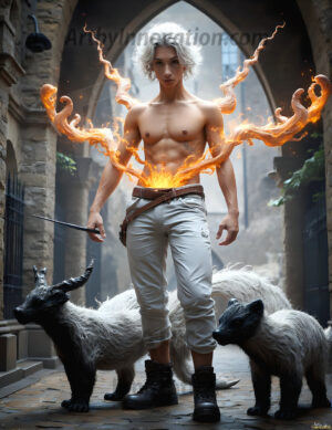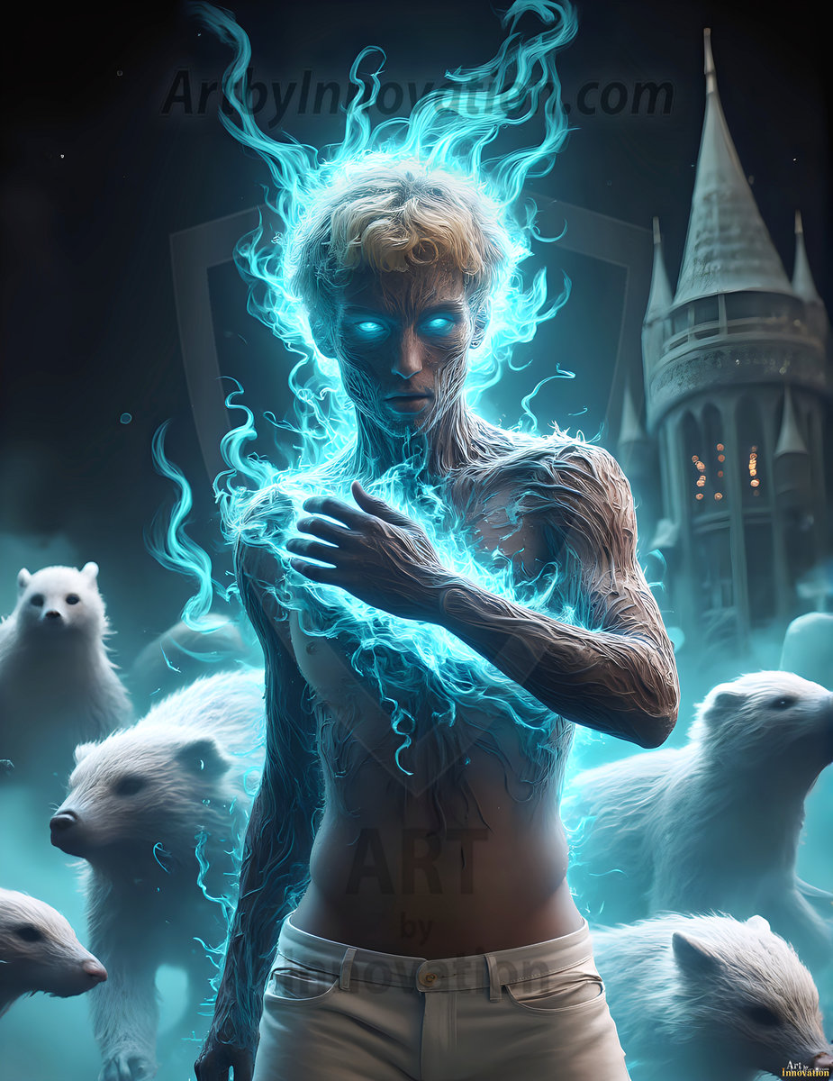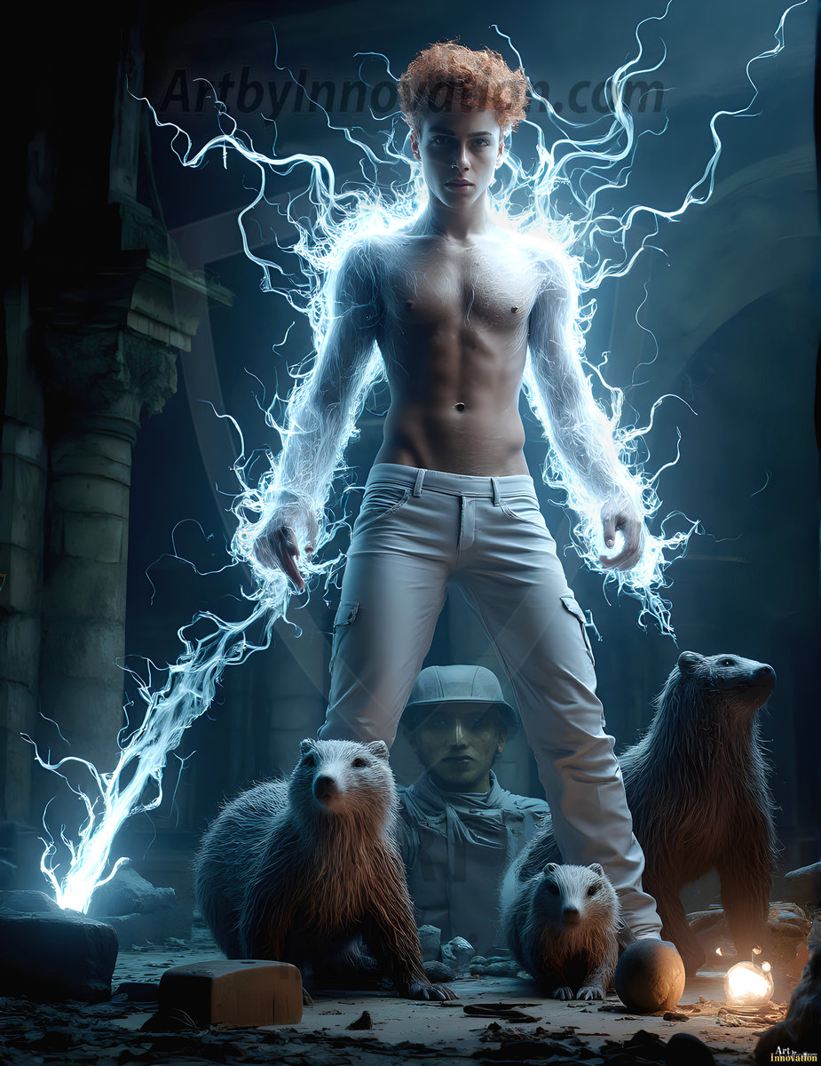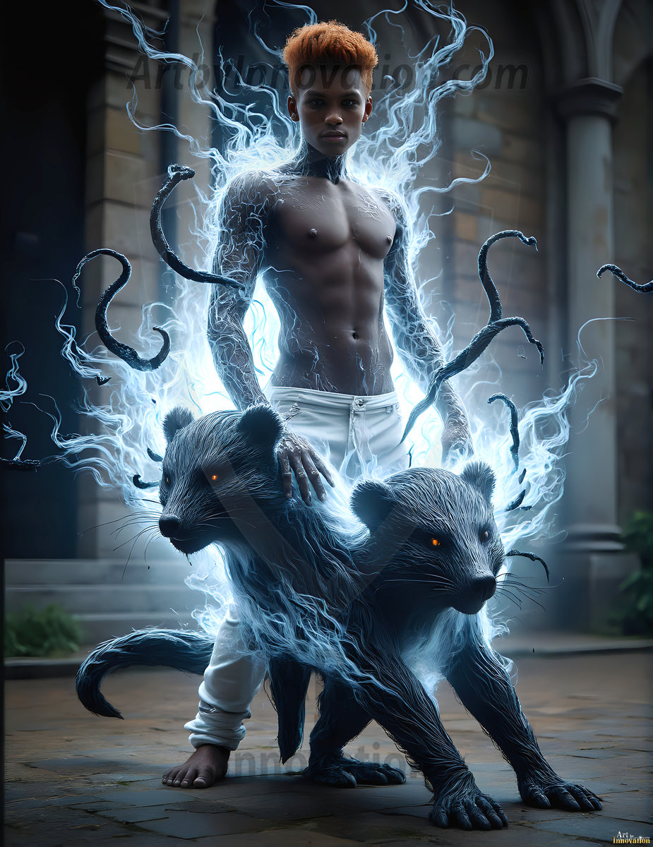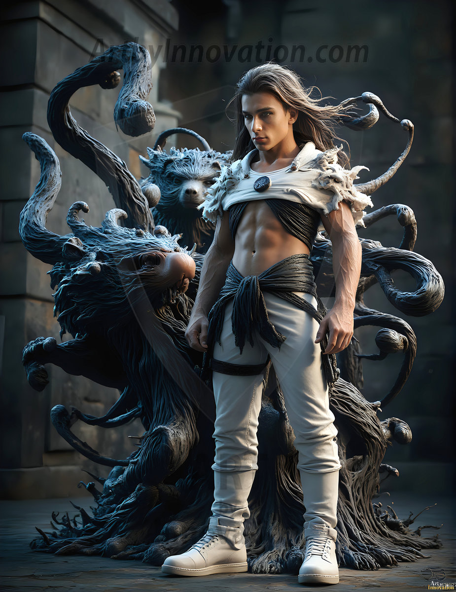 AI-generated abstract art — handsome men controlling swirling vortexes of vibrant colorful fluid and water in motion.