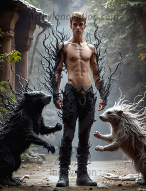 Handsome AI-generated male fairies with enormous shimmering crystal wings in enchanted fantasy forests.