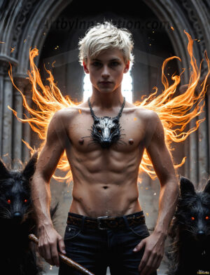 Handsome AI-generated male warrior angels in divine holy armor with vibrant wings — God’s warriors in the golden city of heaven.